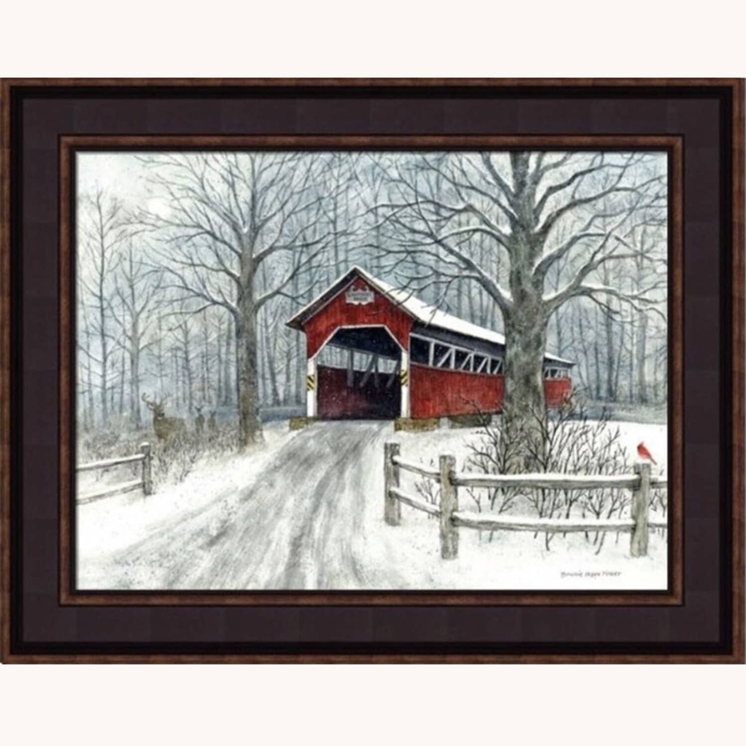 Availability: In Stock$92.99The Covered Bridge Print by Bonnie Fisher brings back a time gone by. It has a lightly distressed frame, black with stained edges, no glass. This item ships from our supplier in 2 to 3 weeks in the continental United States. Size 16 x 12.Winter Blue Star Barn by Bonnie Fisher
