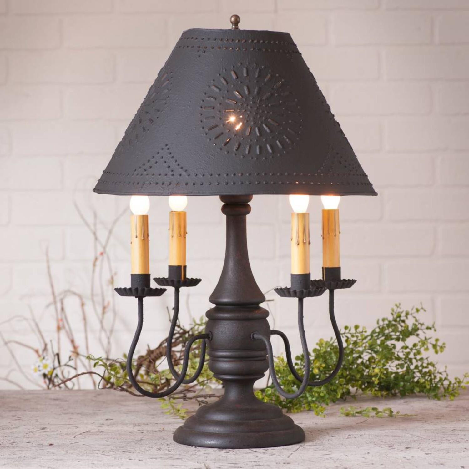 A finely crafted table lamp with four candelabra arms and a standard socket on top with three way lighting capability. Our Jamestown Lamp exudes a genteel country feeling like that on a gentleman's farm or a plantation of the Old South.