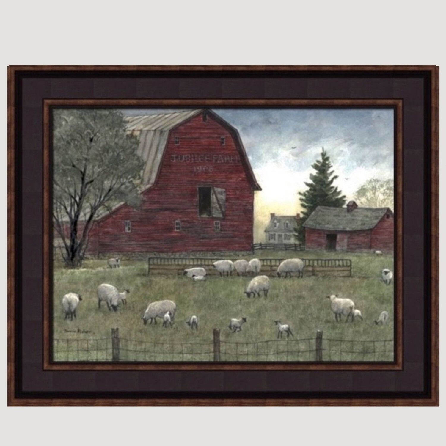 Jubilee Farm by Bonnie Fisher comes in size 16 x 12. It has a lightly distressed frame, black with stained edges, no glass. This item ships from our supplier in 2 to 3 weeks in the continental United States.