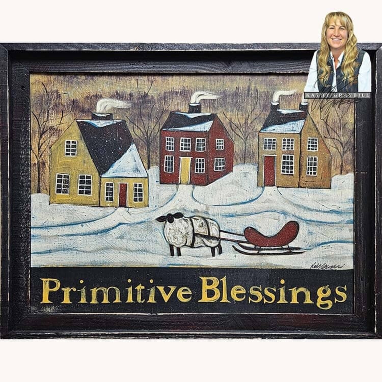 The brushes of Kathy Graybill have captured the beautiful Salt Box Houses of Colonial Times. Her imagination included a sheep drawn sleigh. Name Primitive Blessings. Hand Painted and Signed in the USA.