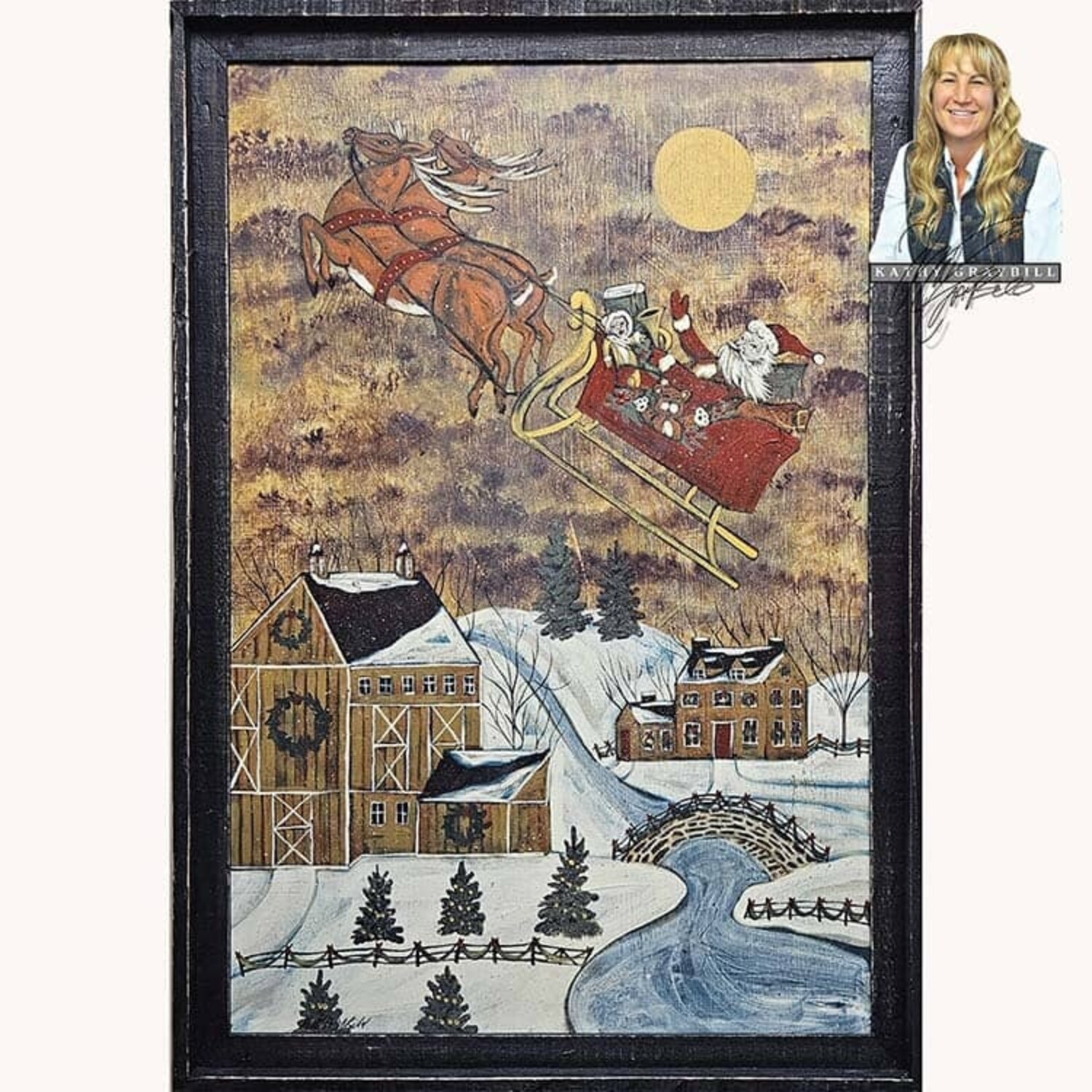 Kathy Graybill Hand Painted Santa with Sleigh & Flying Reindeer Original Artwork - 27" x 39"