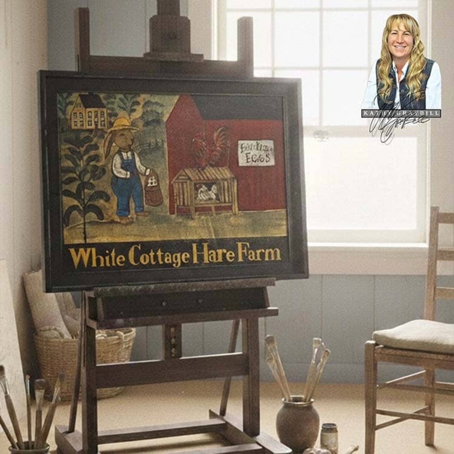 Kathy Graybill Hand Painted White Cottage Hare Farm Original Artwork - 21" x 27"