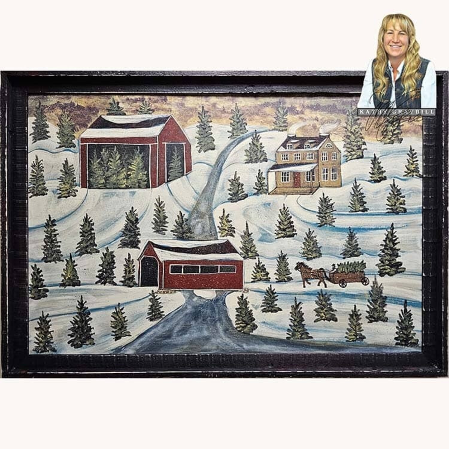 Availability: In Stock$485.00This hand painted scene captures the peaceful landscape of red barns dusted with snow and paired with beautiful horses. This piece adds warmth and charm to any decor. Original signed artwork from Folk Artist Kathy Graybill.