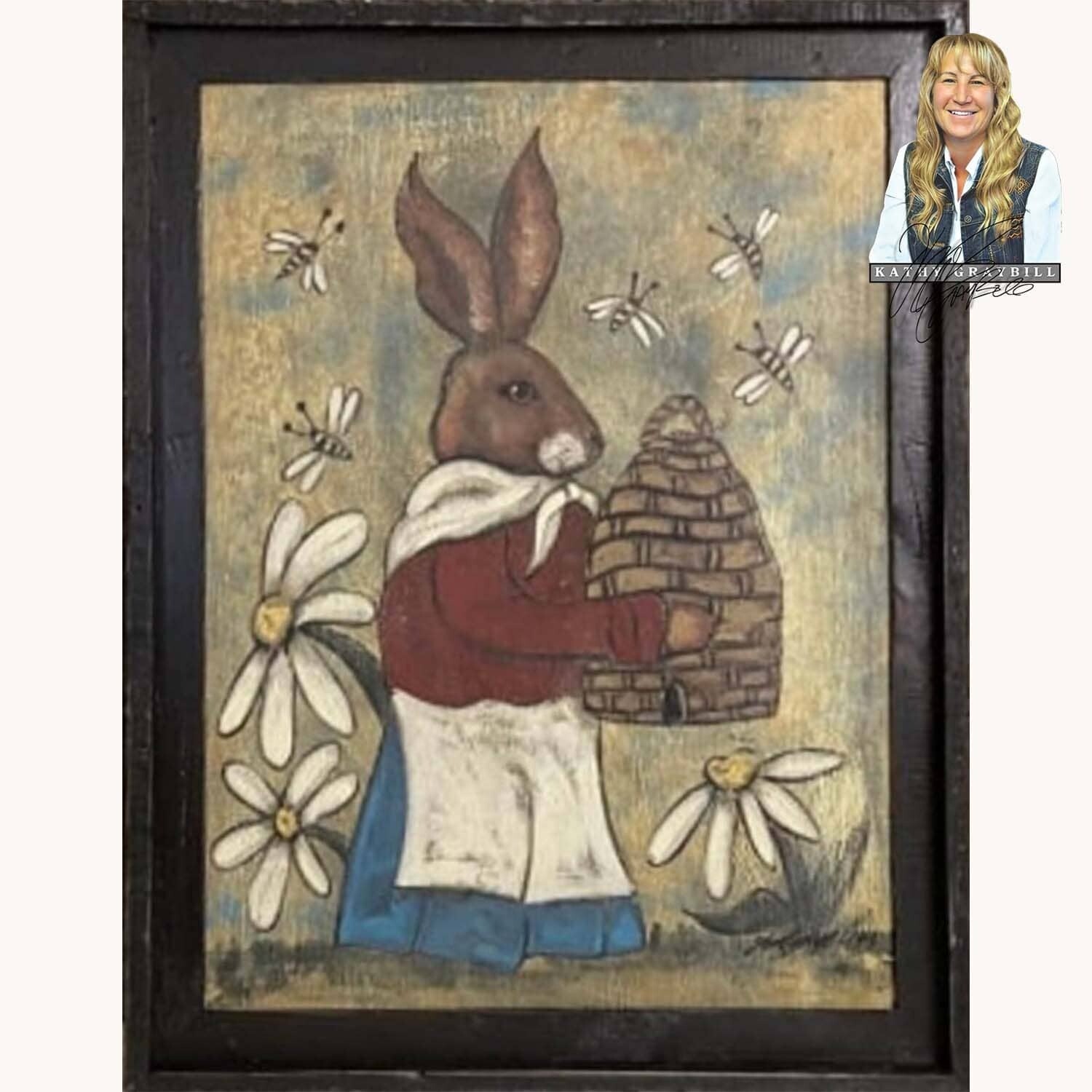 The Original Art of Kathy Graybill captures this whimsical pose of the lady bunny holding the Bee Skep. Hand-painted in the USA, Kathy's Primitive art is in collections across America. Framed in a black solid wood frame.