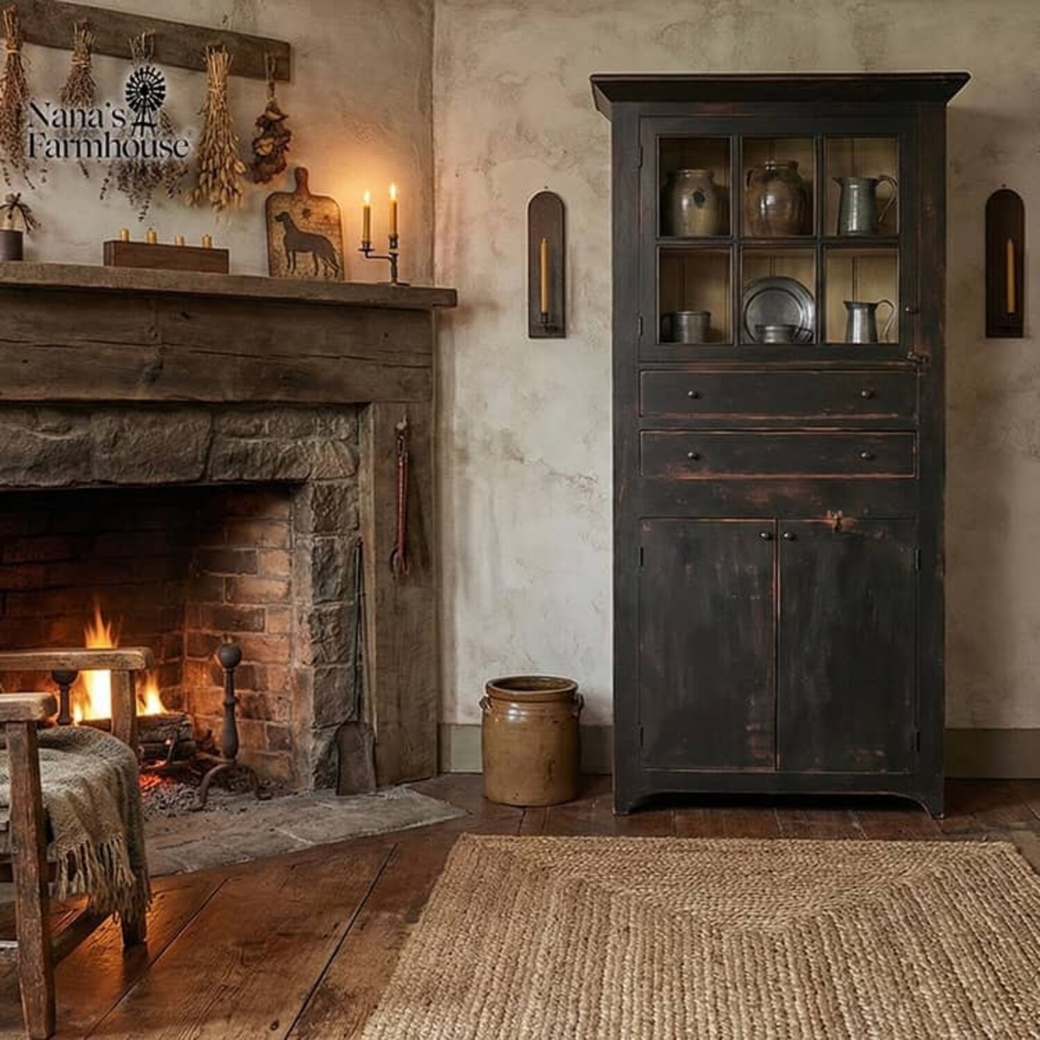 This heirloom is known as the Kenny Cupboard. Made of choice lumber & 100 year old wavy glass from homes on the East Coast. This black over red cabinet is in-stock. This item can be ordered in other colors. Call to inquire.