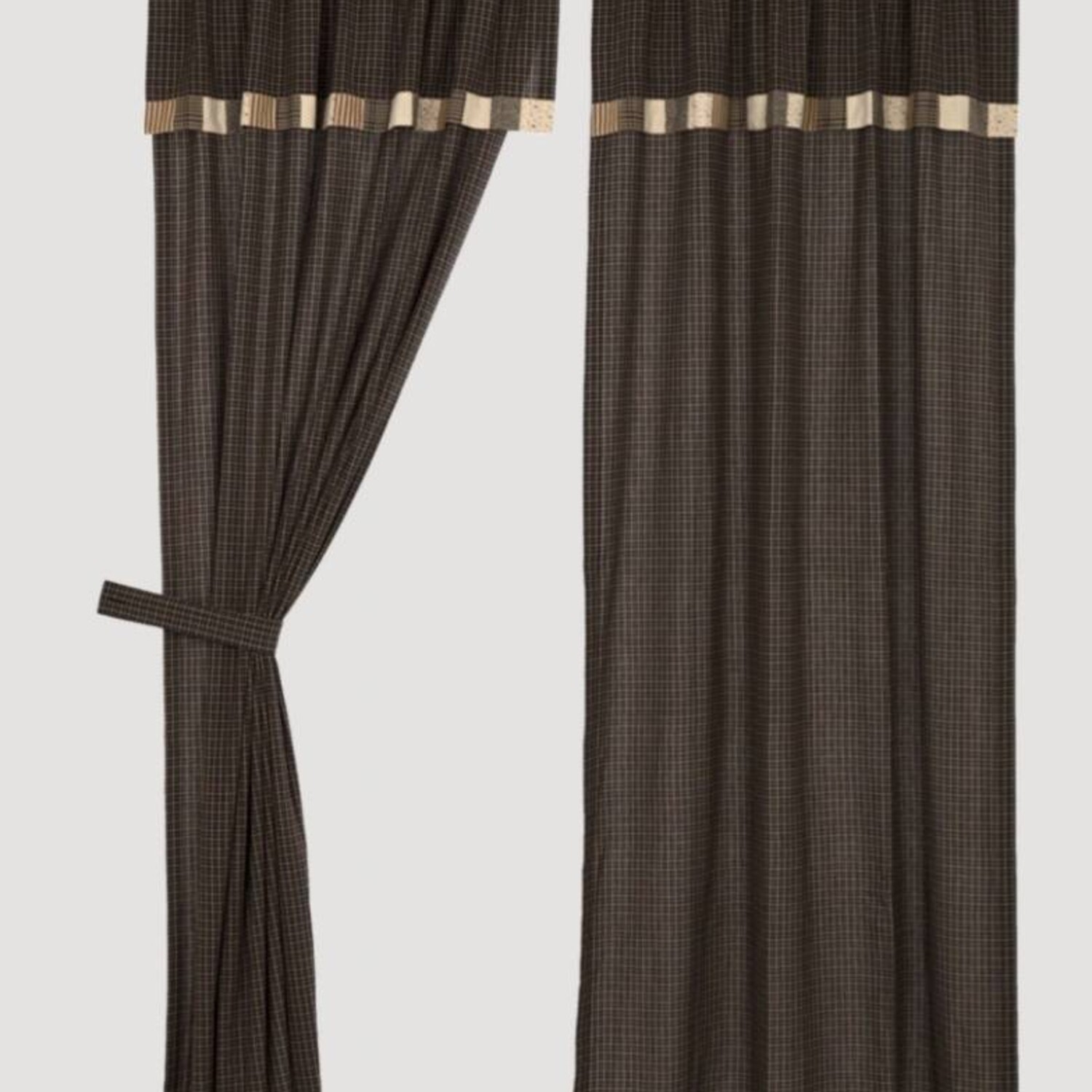 Availability: In Stock$40.95Bring the romantic scalloped edge of the Kettle Grove Plaid Prairie Short Panels to your Country home.. The rich colors of black & beige in a micro check design. Panels are lined & sold as a set. Each panel measure 84" L x 40" W. Includes set of tiebacks.