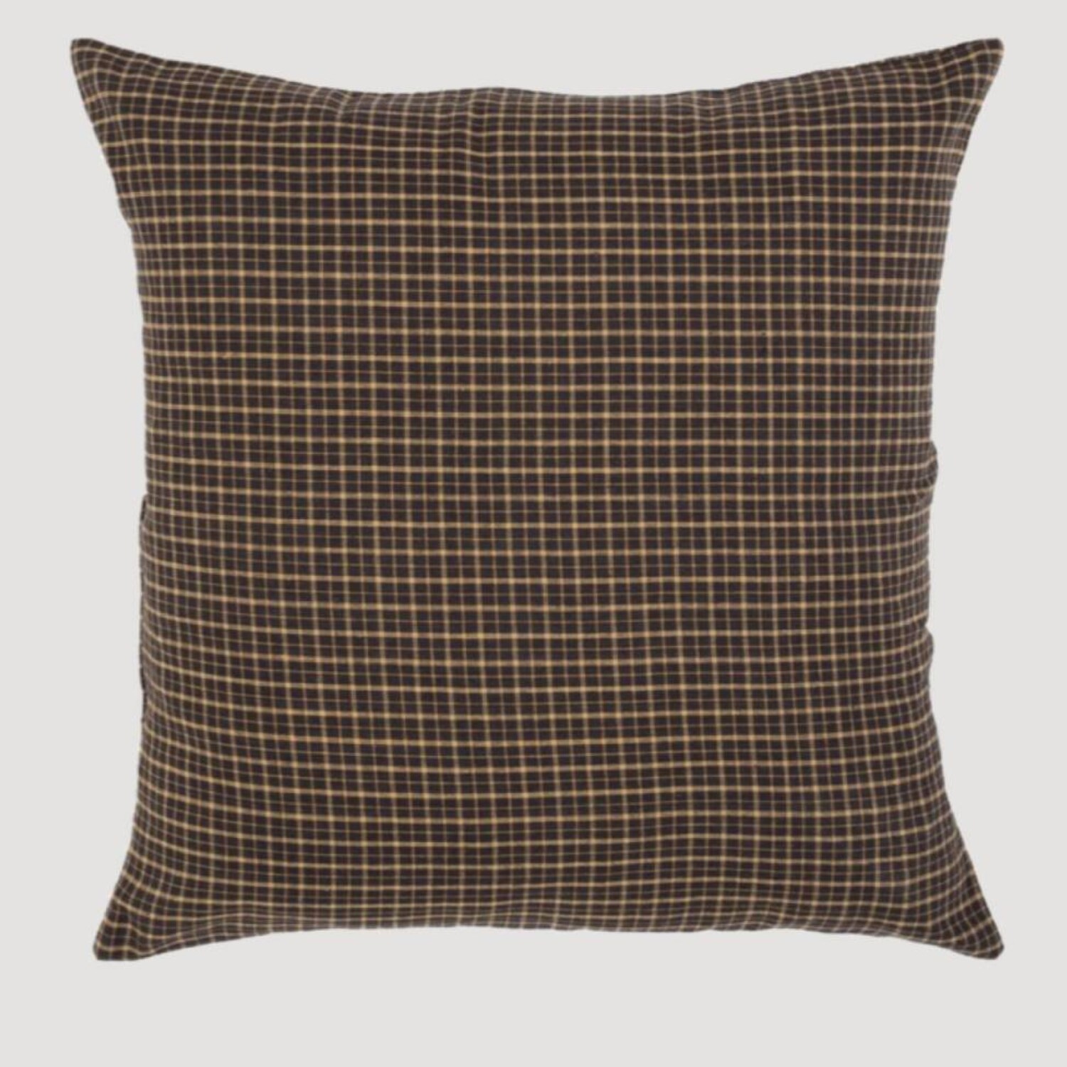 The Kettle Grove Plaid Pillow in basic black & tan is a great accent in most any room! Front & back of pillow have same plaid design with 2 black chalk button closures (1 spare hidden button). Machine stitched. Measures 16" x 16".