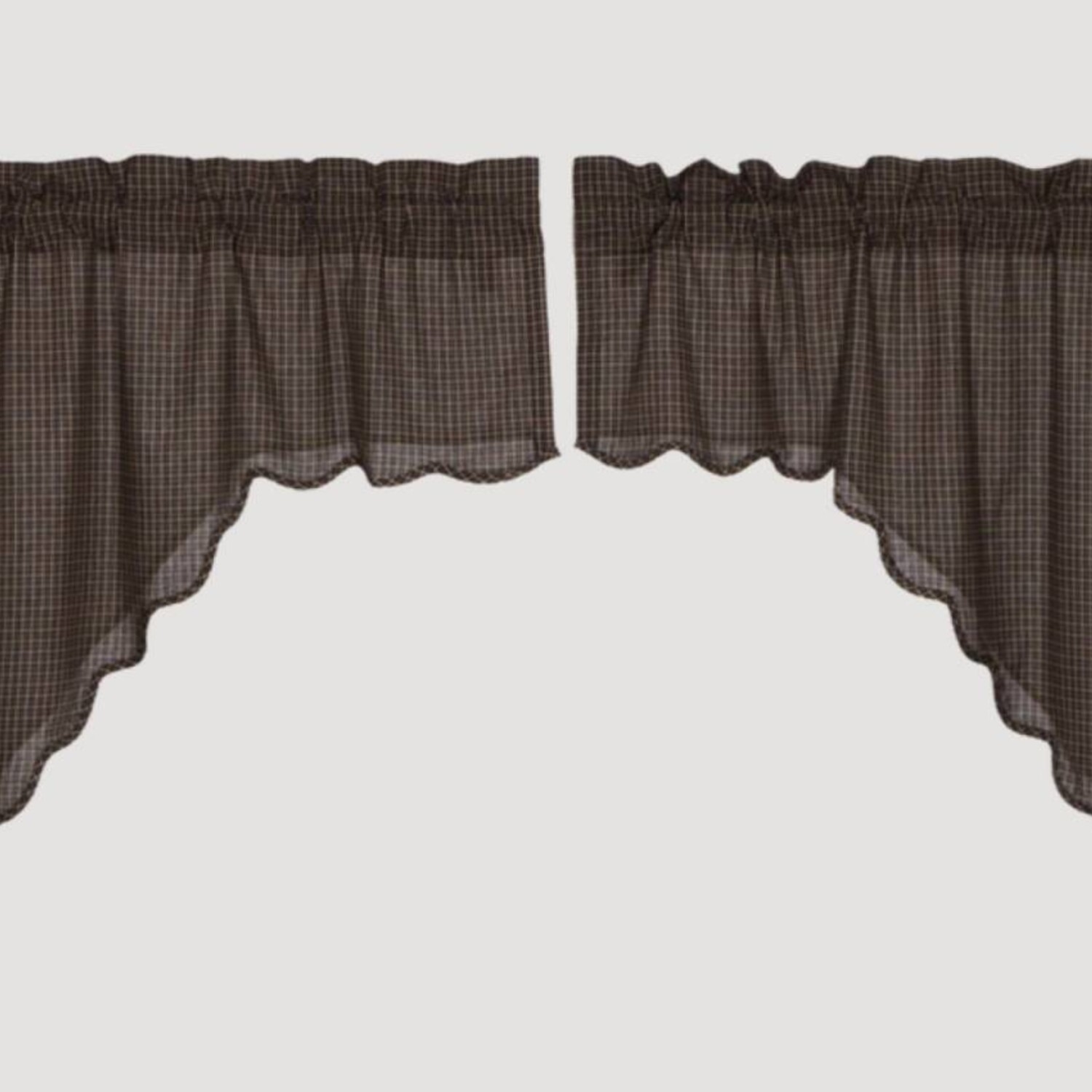 Give your Primitive home a romantic touch with the scalloped edge of the Kettle Grove Plaid Scalloped Swag. The rich colors of black & beige in a micro check design. Panels are lined & sold as a set. Measures 36"x36"x16".