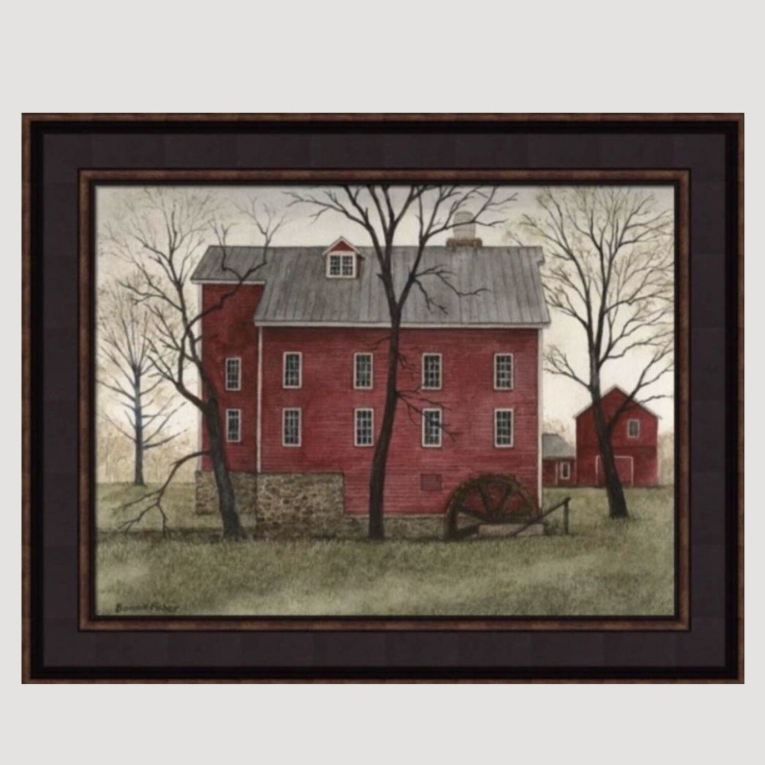The Kirby's Mill by Bonnie Fisher comes in size 16 x 16. It has a lightly distressed frame, black with stained edges, no glass. This item ships from our supplier in 2 to 3 weeks in the continental United States.