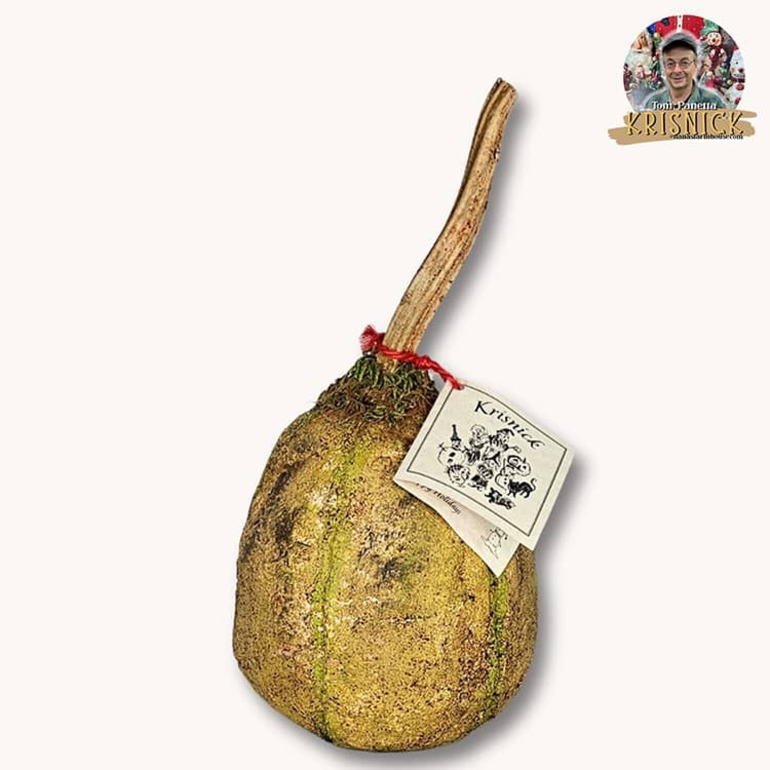 A unique white and green Pumpkin from Krisnick. Features a long dried stem. Handmade in the USA.