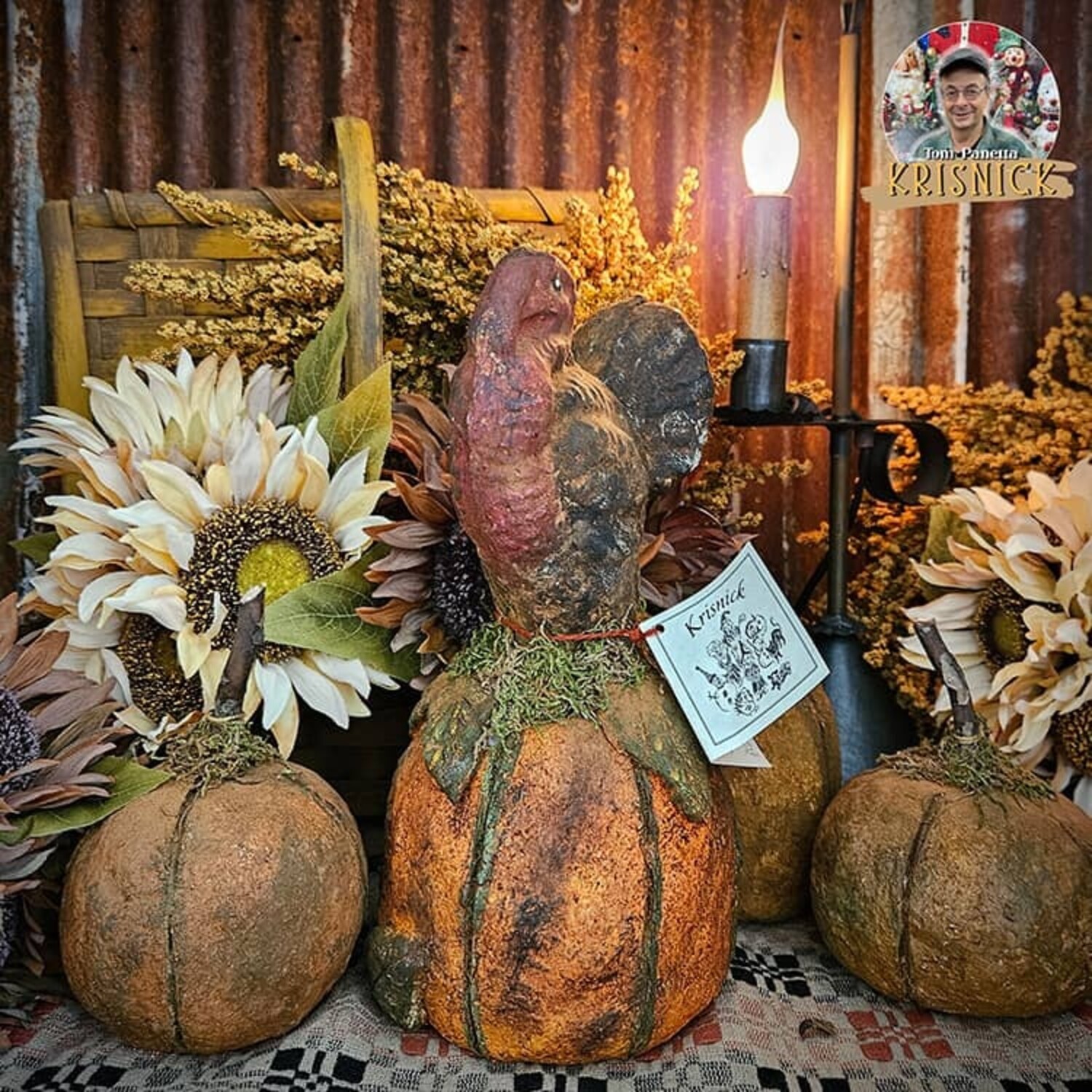Krisnick- Turkey on Pumpkin is a unique piece that you will want to add to your fall decor. Standing at 10.5 inches tall, it's an ideal size for mantle, shelf or as a centerpiece . In stock and ready to ship.