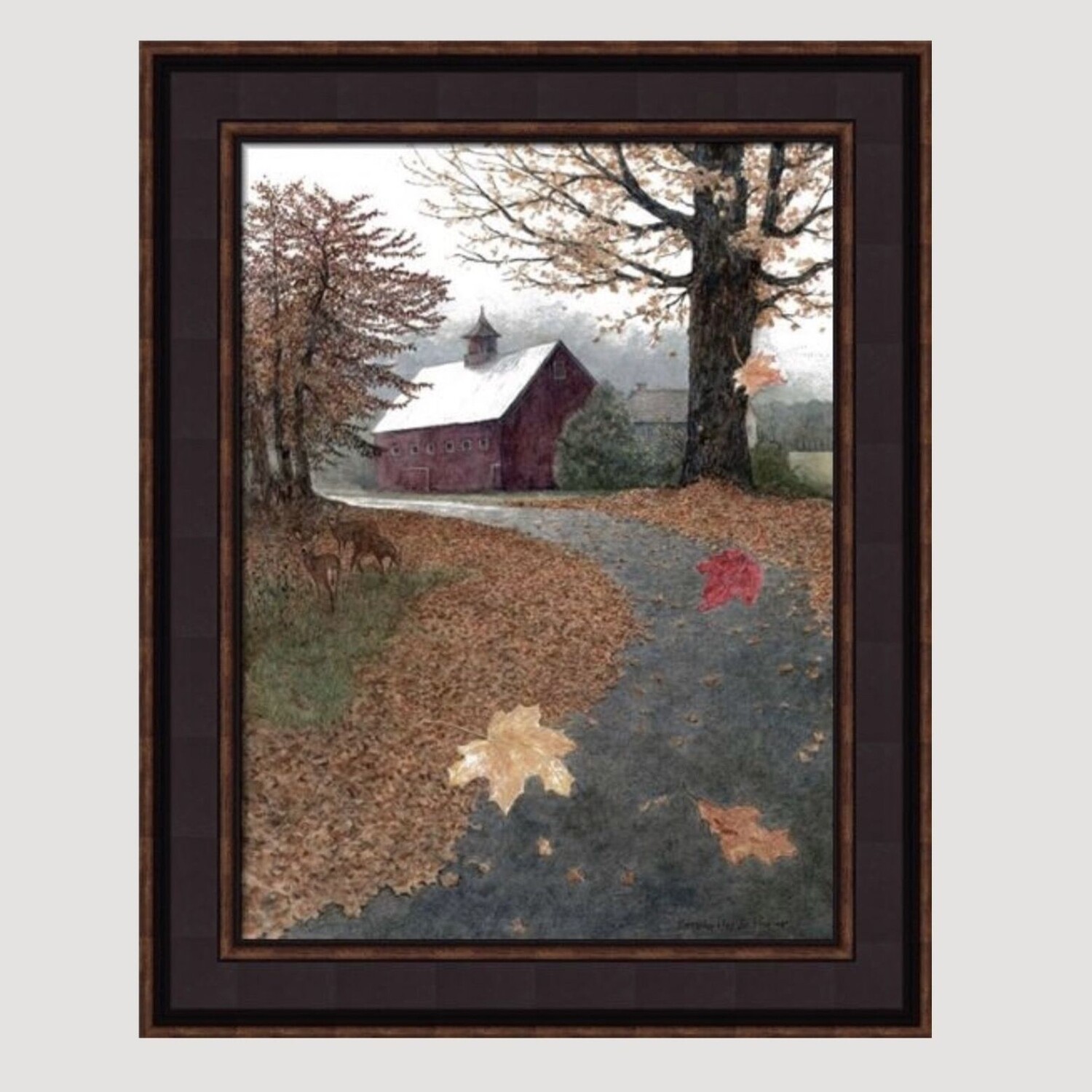Sure to be a favorite, Bonnie Fisher has captured the Fall season with Leaves on canvas. Autumn brings rich colors to the landscape and Bonnie has captured them so realistically! 16 x 12, lightly distressed frame, black with stained edges, no glass.