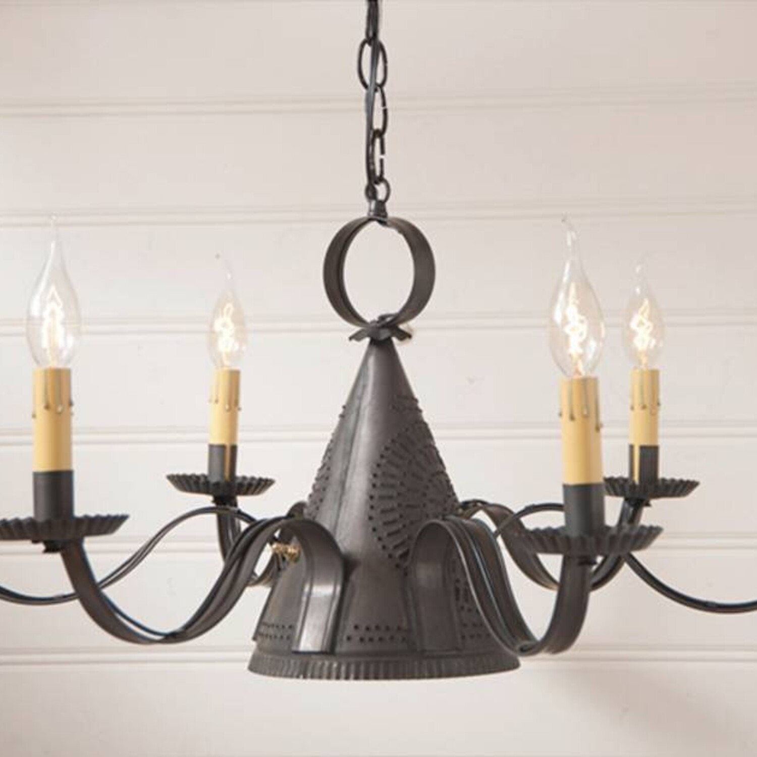 Direct wired with a standard socket down light, 50 watts max., six candelabra sockets, 60 watts max. per arm, 3-way switch. 7 feet of wire, 3 feet of chain, and a matching ceiling plate included. Additional chain may be ordered. Blackened Tin finish. Handcrafted in Pennsylvania. This light is UL listed and has a 5 year guarantee.