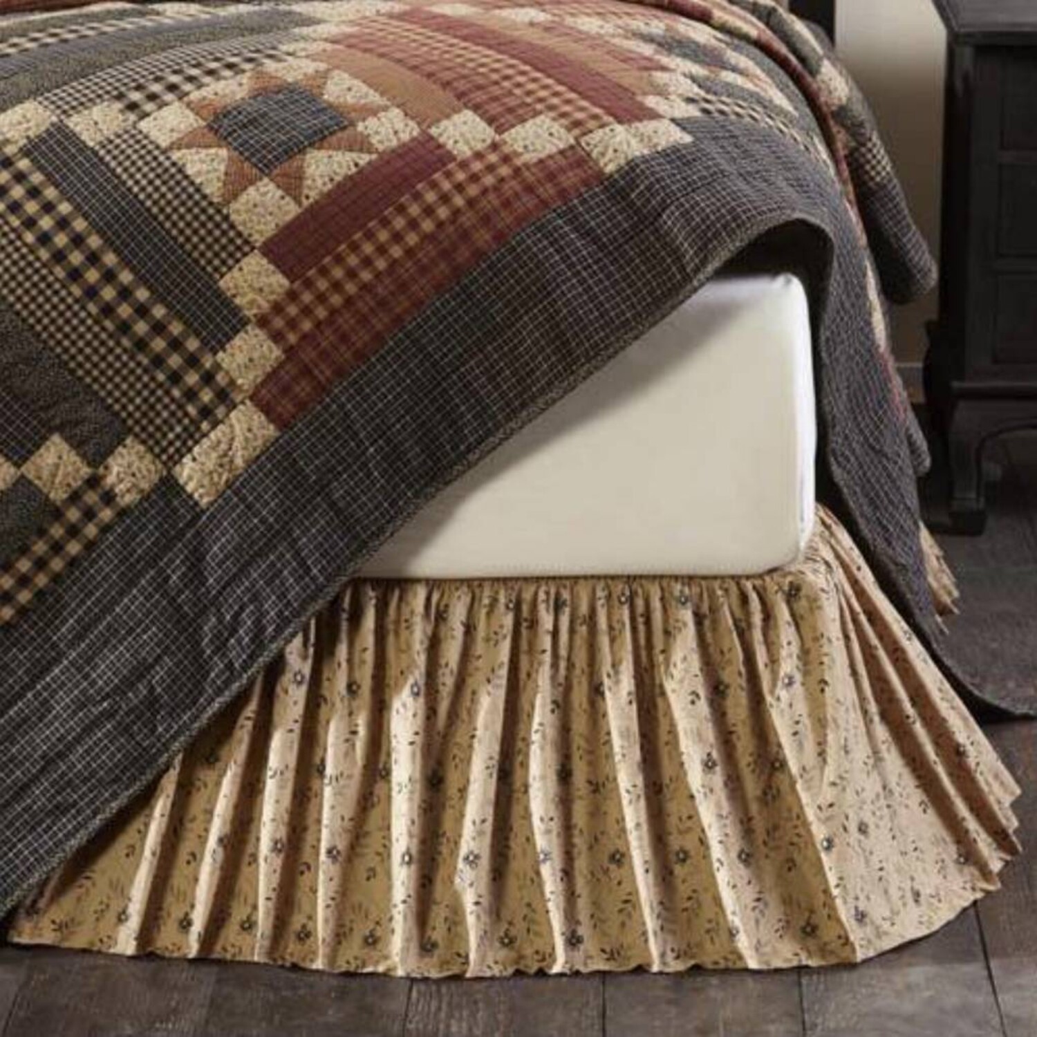 The Maisie Bed Skirt features a ditsy floral print on a tan base. The whimsical qualities of this bed skirt make it perfect for pairing with the stout log cabin blocks on the quilt. 100% cotton, finished with split corners.