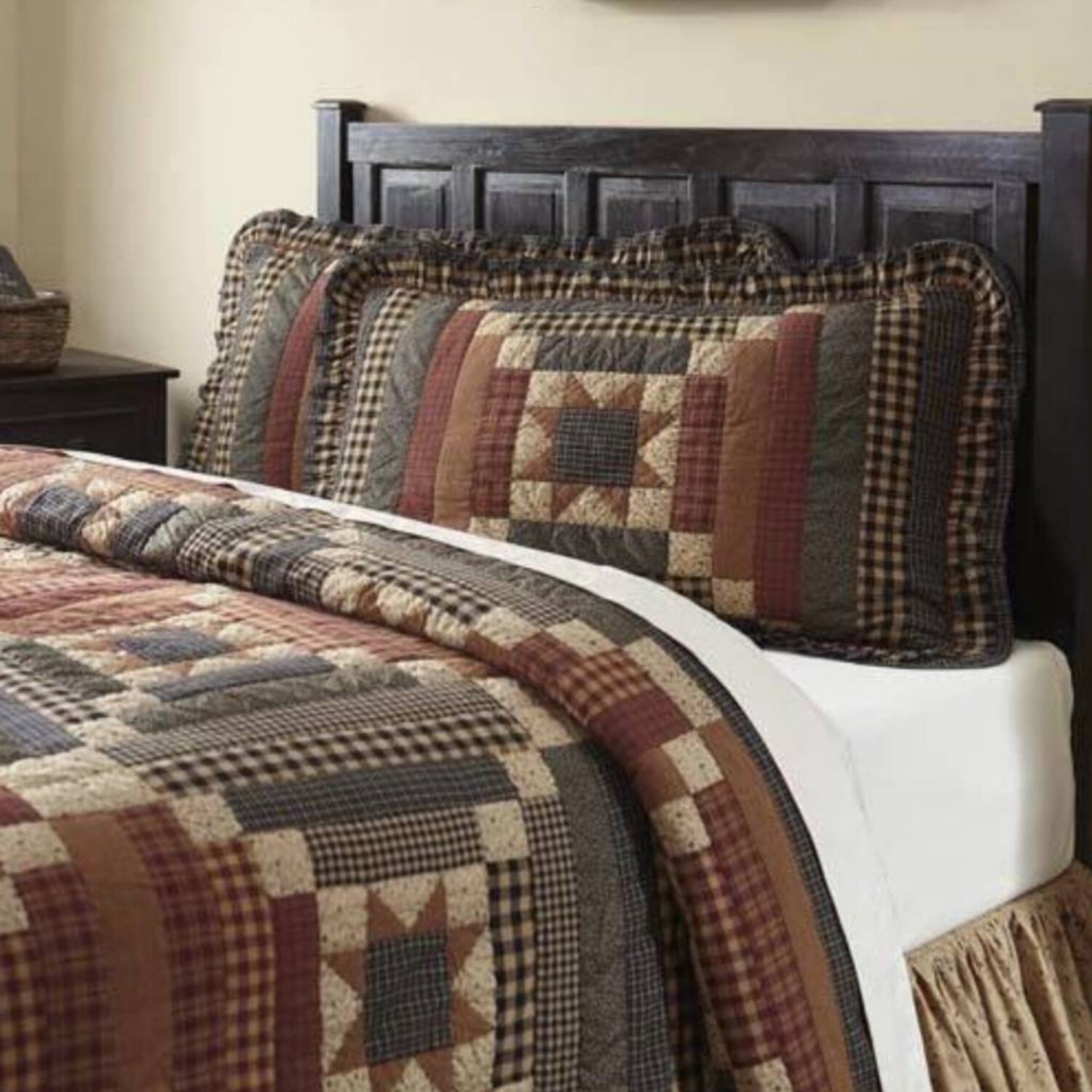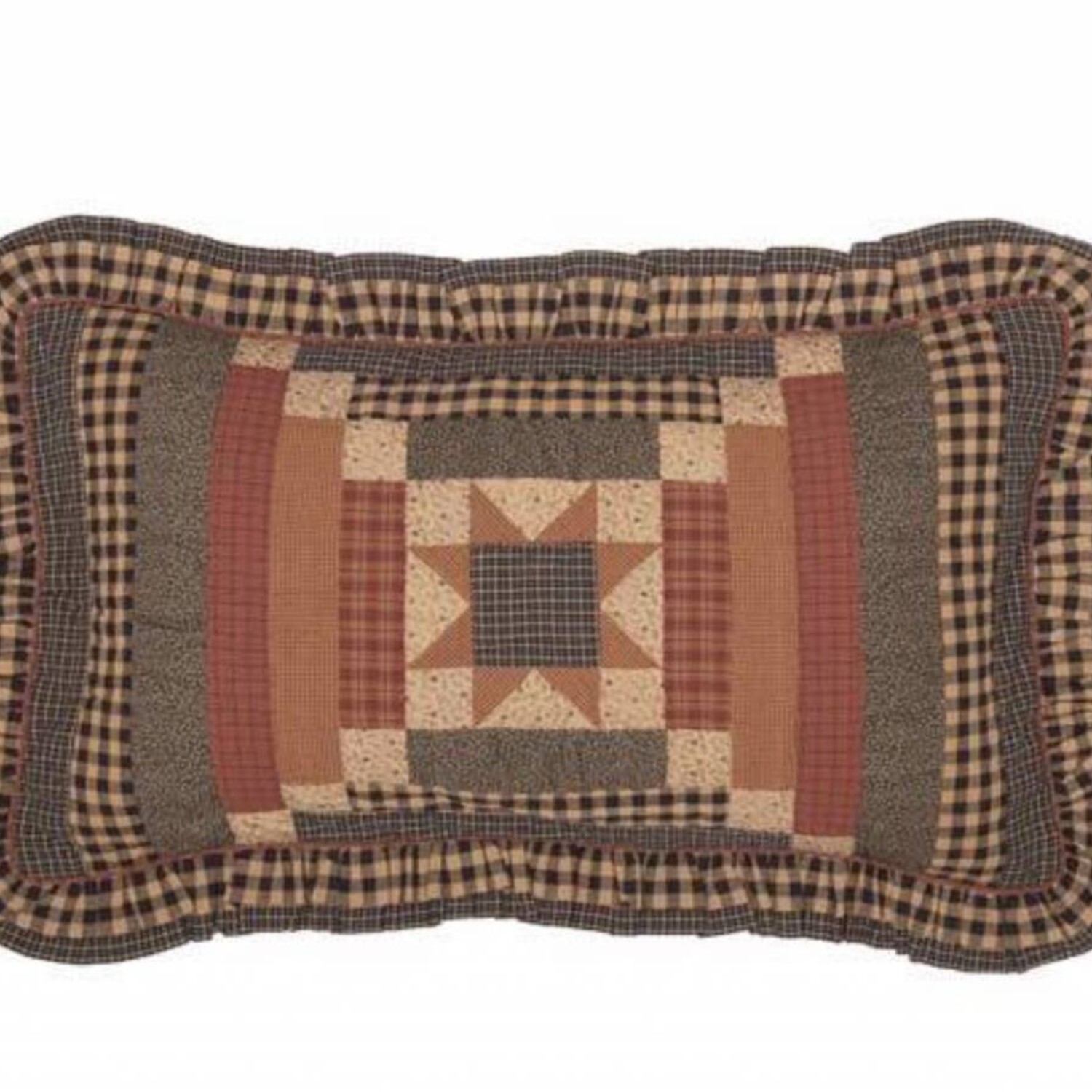 The Maisie King Sham has a single 8-point star centered in a tan Irish chain of ditsy floral prints & stout courthouse step blocks of country black & burgundy. Hand-quilted, 100% cotton, reverses to black & tan check found on front.