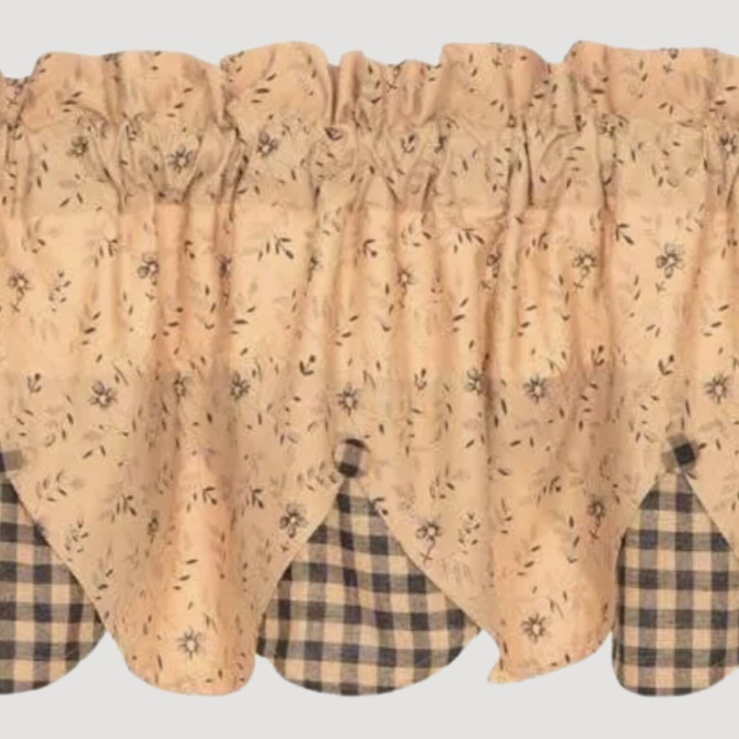 Availability: In Stock$45.95The Maisie Tier Set features a ditsy floral pattern design for a perfectly coordinated look throughout the home. A black & tan check pattern peeks from behind scalloping & matching check buttons adorn the crest of the check scalloping. Lined, 100% cotton. - $18.95