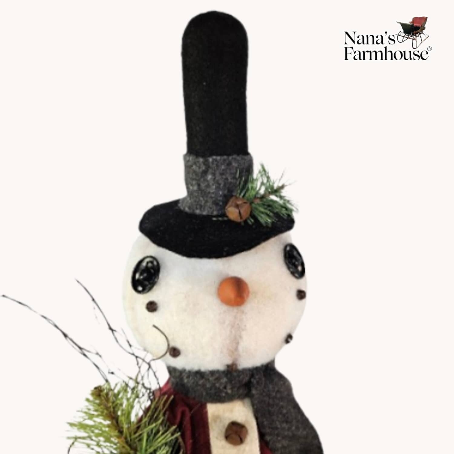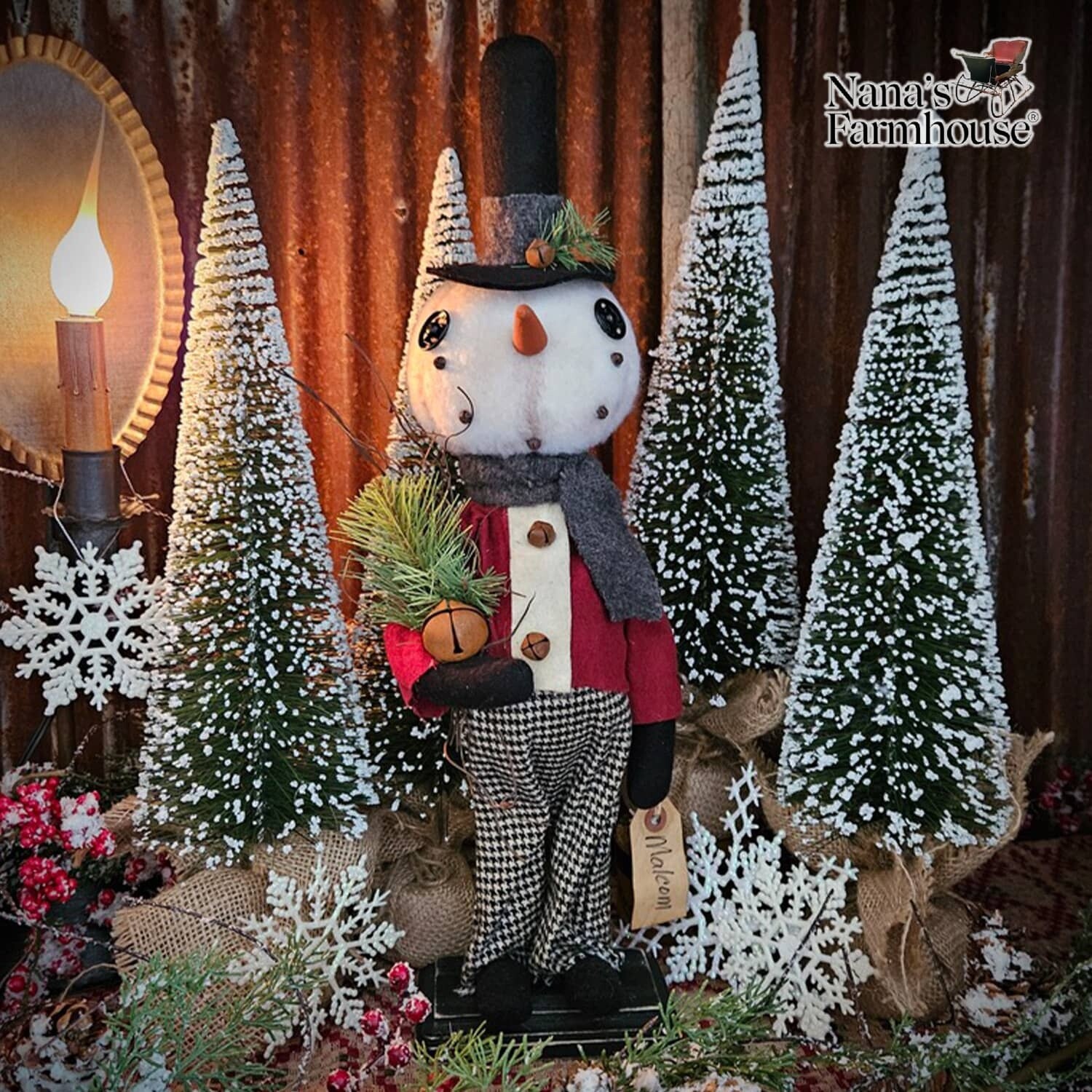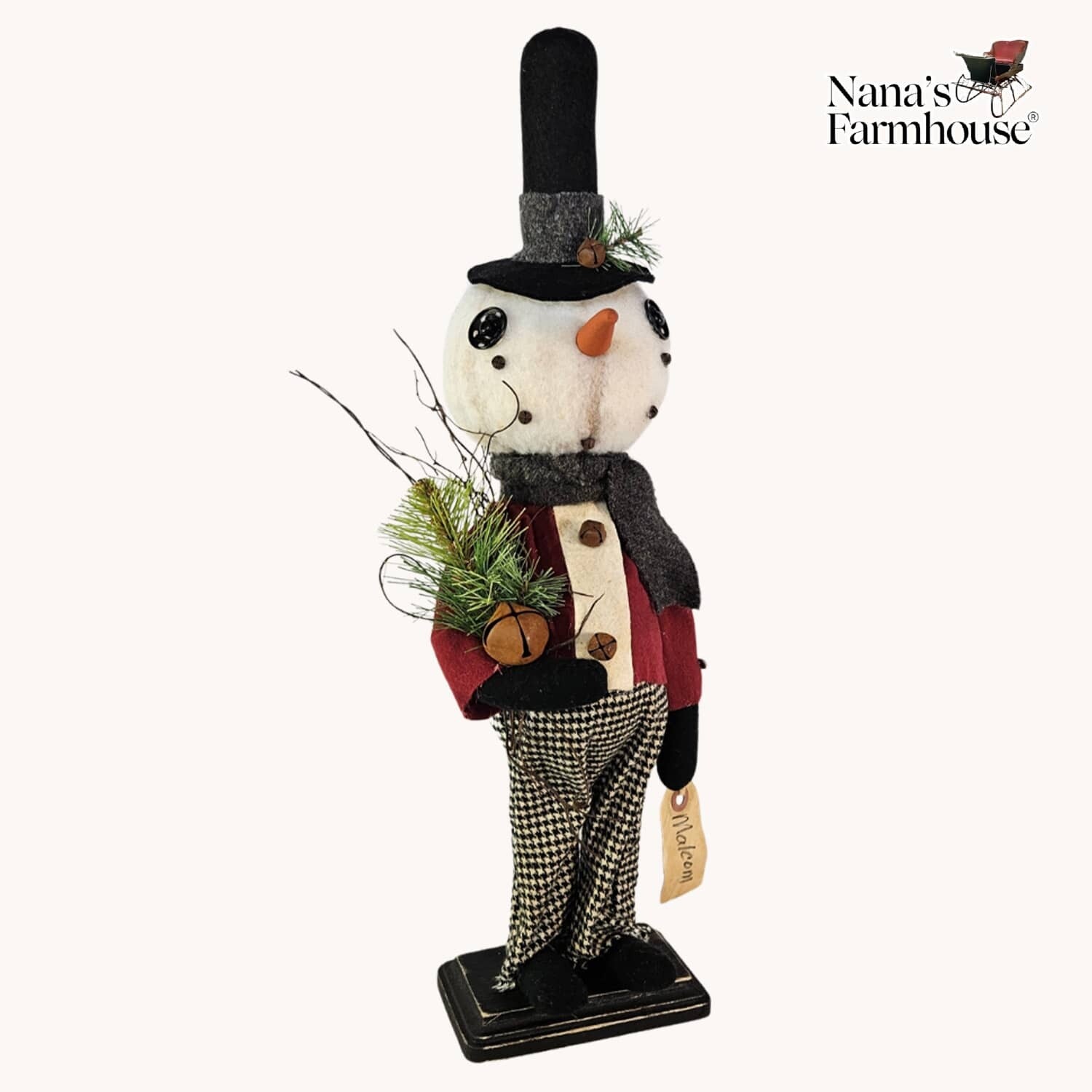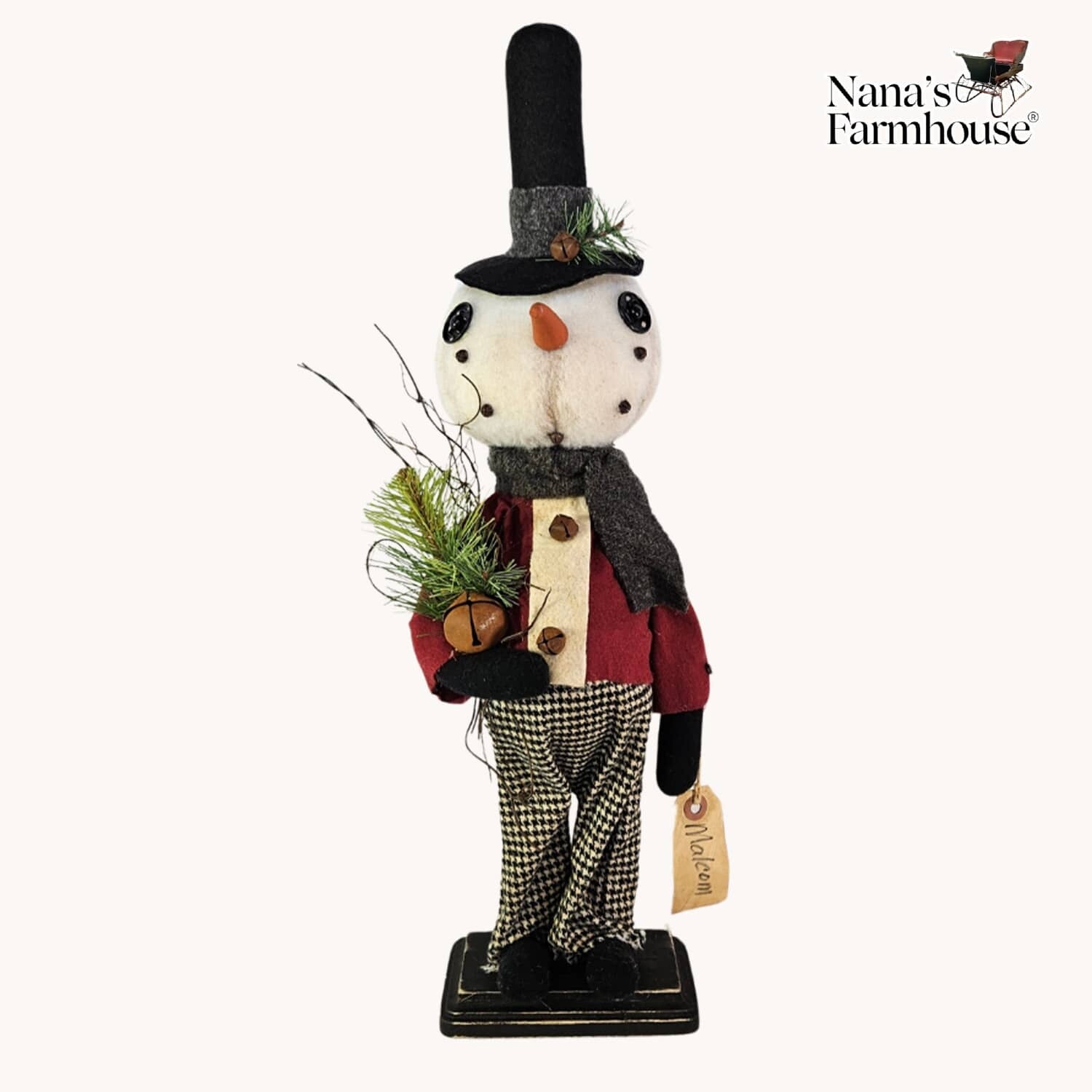 Meet Malcolm the snowboy! A Dapper dresser in houndstooth checked pants and a flannel maroon shirt. Black stovepipe hat adorned with bell and greenery. Carrot nose is prominent and on his endearing face. In stock and ready to ship.