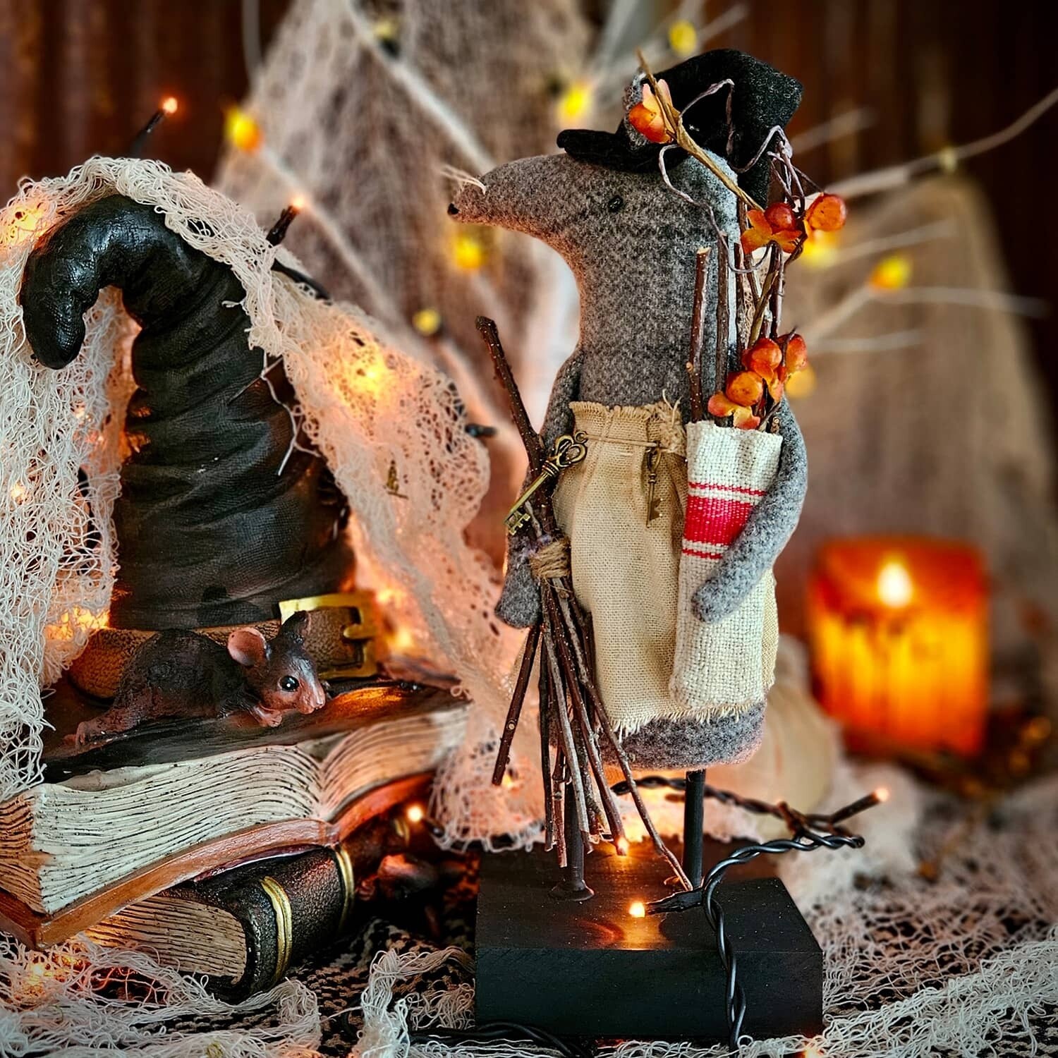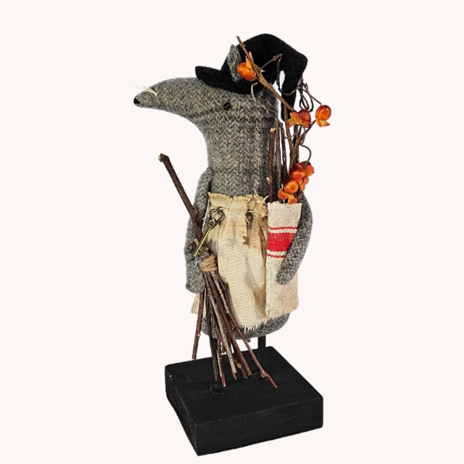 Keys hanging from her apron and a bundle of twigs and bag of bittersweet berries, mouse witch is ready for fall. She is sure to cast a spell on you with her whimsy and charm! In stock and ready to ship.