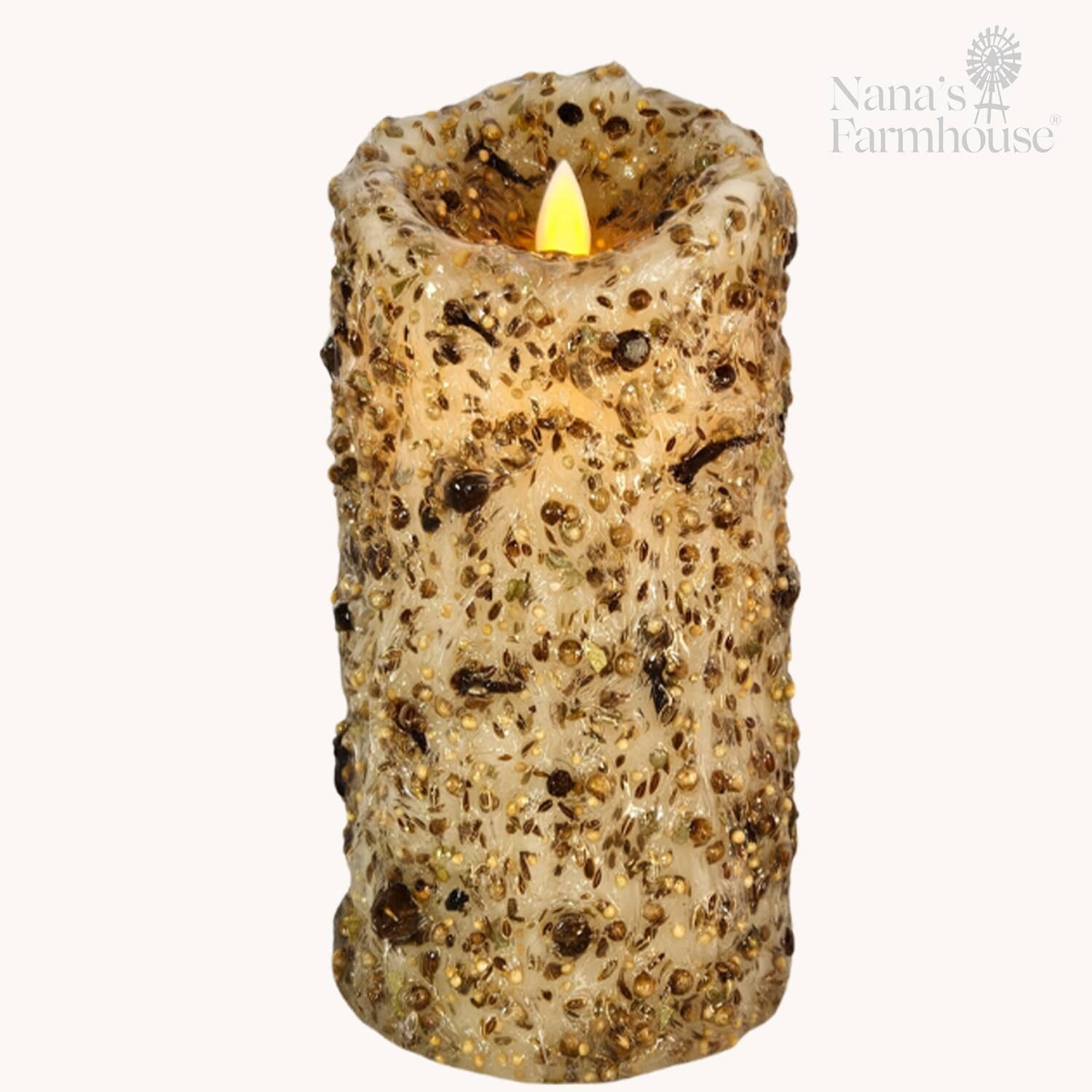 This 7" Moving Flame Pillar candle has a whimsical name of Everything But the Kitchen Sink, and is a beautiful blend. Battery-operated takes 3 AA batteries. In-stock and ready to ship.