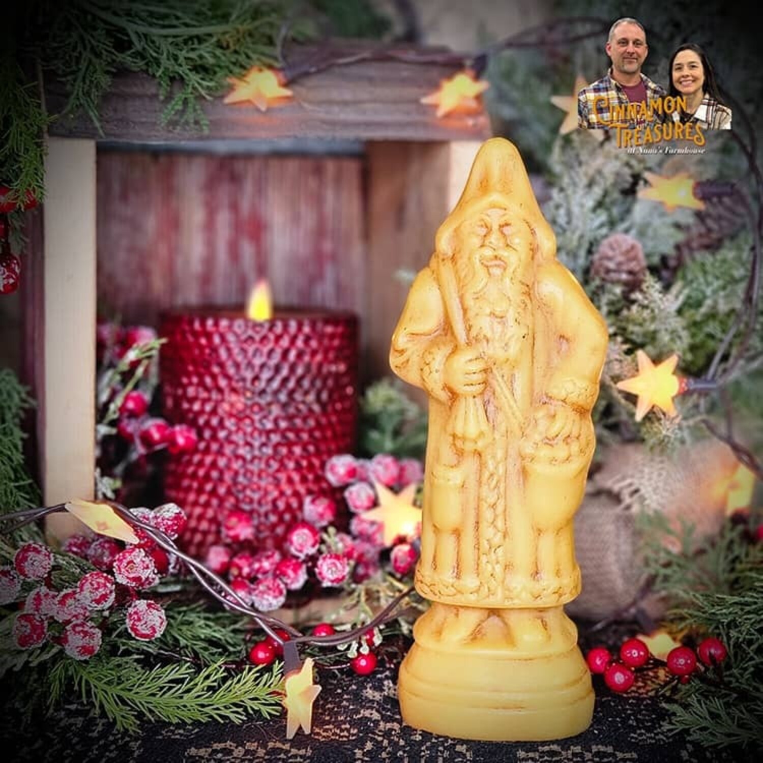 Each piece from this artist is hand made from start to finish. Each starts in its most raw form, a block of pure beeswax. It is melted, hand poured, distinctly hand finished and finally antique each piece. Most of the pieces are poured in rare antique German chocolate molds and all are solid beeswax, that we scent with a cinnamon oil blended exclusively for our products only. Beeswax carving and pouring is a German craft of over 500 years old. Each piece is as unique as nature.
