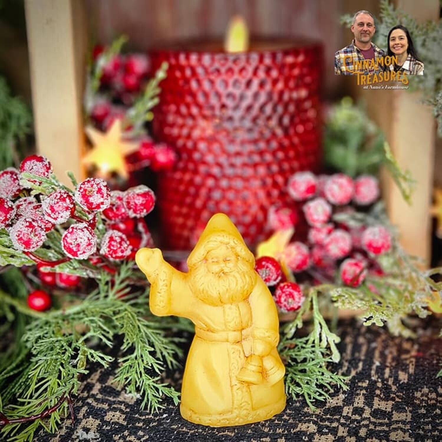 Features of the Natural Beeswax Waving Santa W/Bells Figurine: