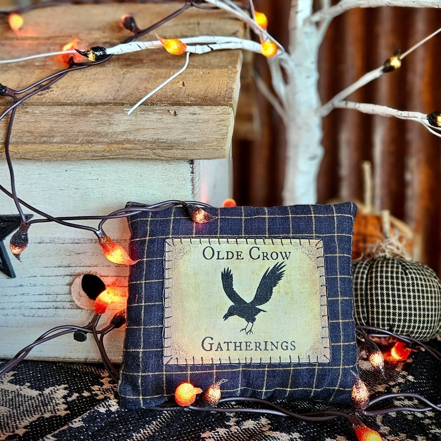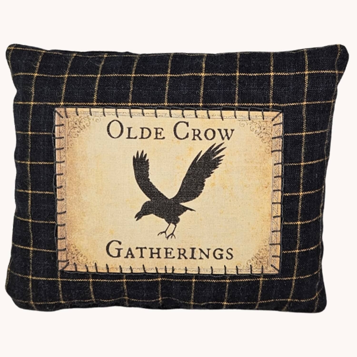 Olde Crow Gatherings emblem is hand appliqued on black checked homespun fabric. Perfect accent for bowl, shelf or fall arrangement. In stock and ready to ship.