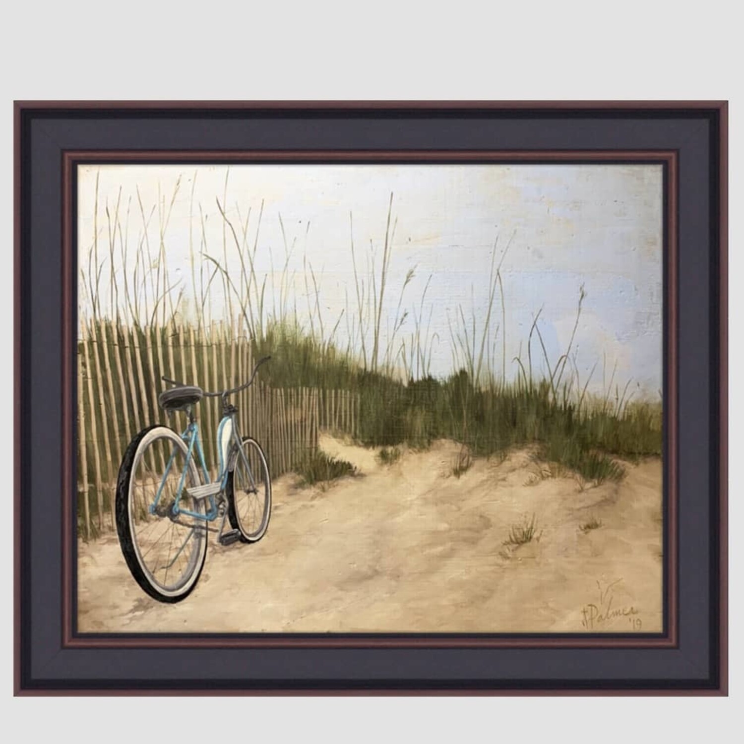 The classic scene of an old bike is captured in this print by primitive Artist Terri Palmer. It looks like a photo it is so realistic as if you were out at the beach. Terri uses acrylics to bring out the colors. Comes in black and walnut frame.