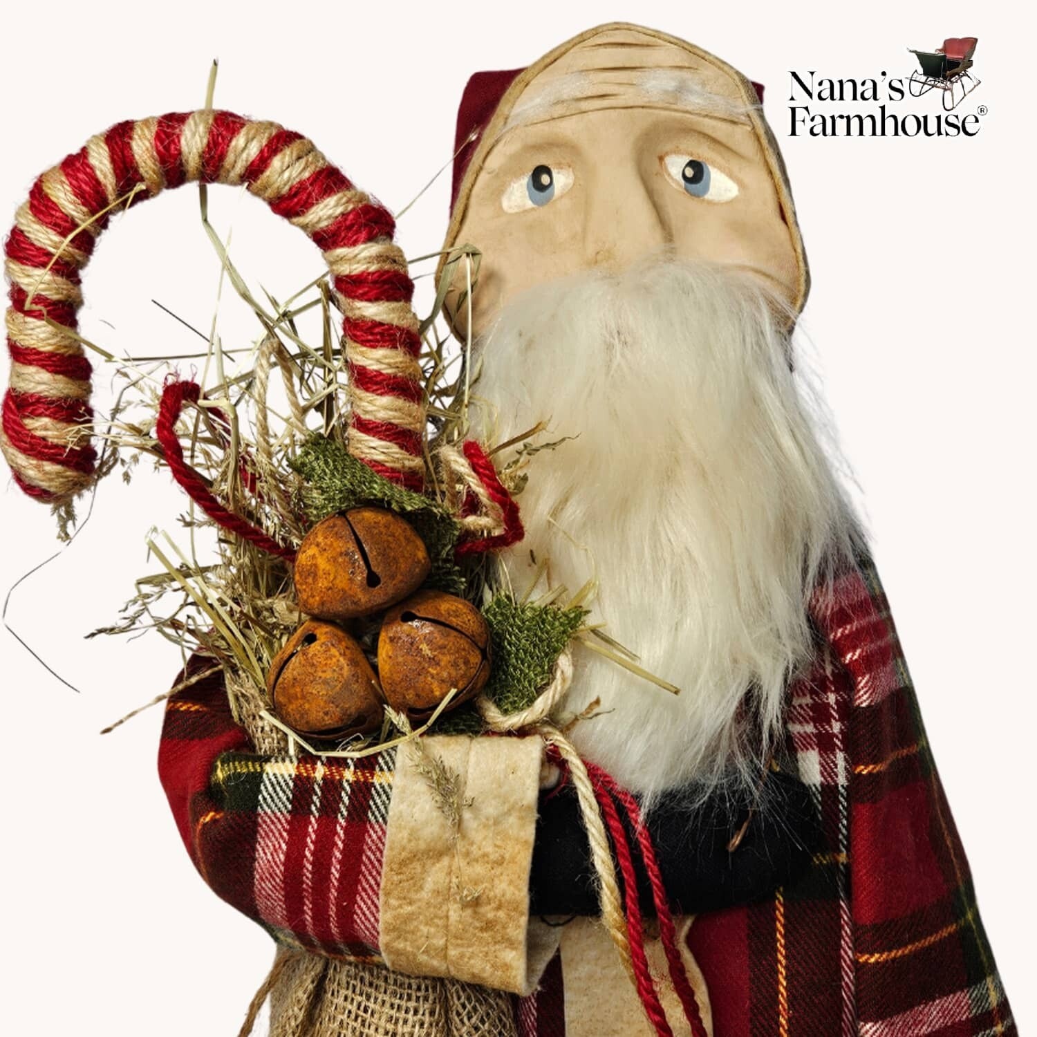 A full length plaid robe edged with cotton trim at hem, sleeves and front outfit this Santa. A long tailed stocking hat complete his attire. Carrying a burlap sack with candy cane, rusted bells and straw are held in his arm. Rustic charm!