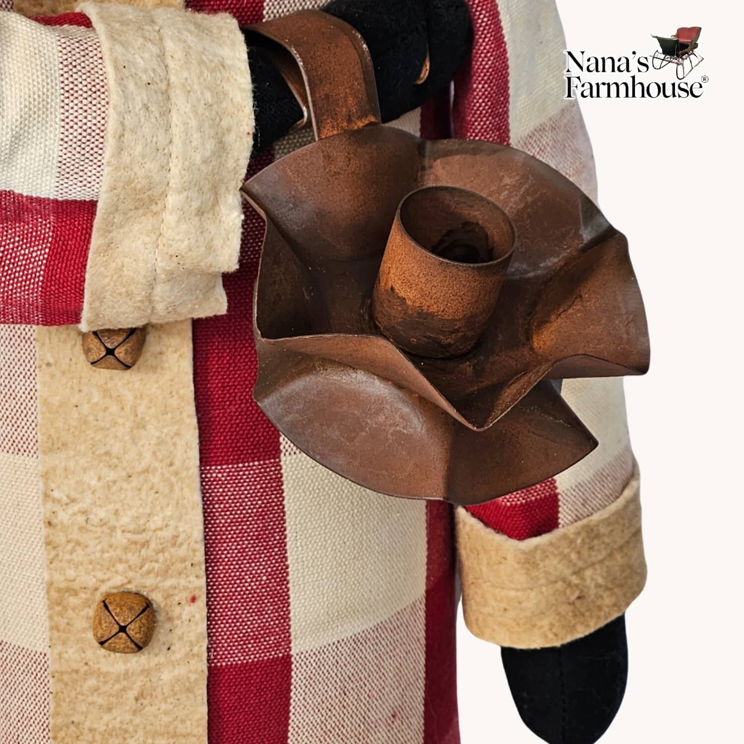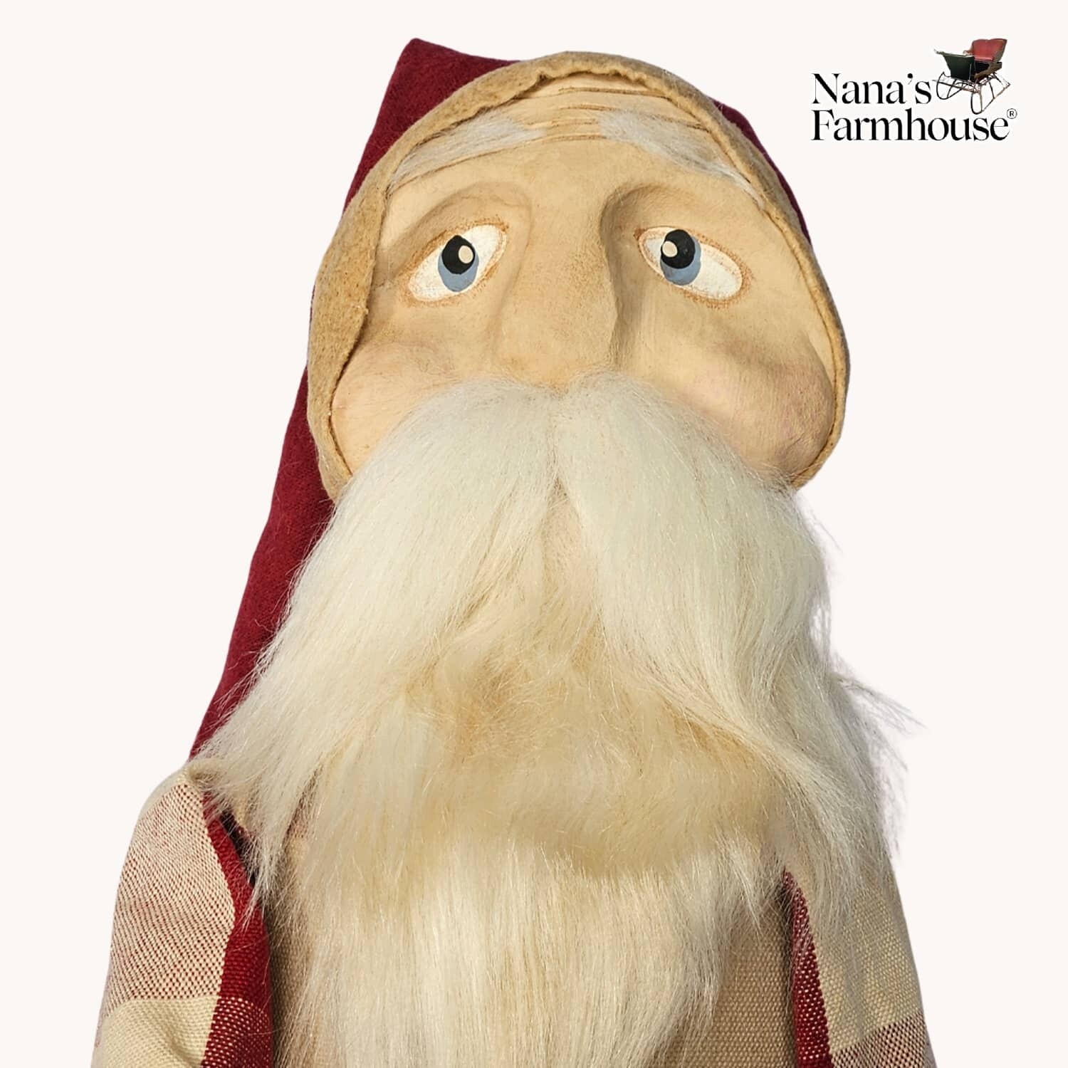 Carrying his taper holder, this pencil Santa is clad in Red check robe and long stocking cap. Flowing white beard and bushy eyebrows frame his face. Rustic folk art Christmas charm! In stock and ready to ship.