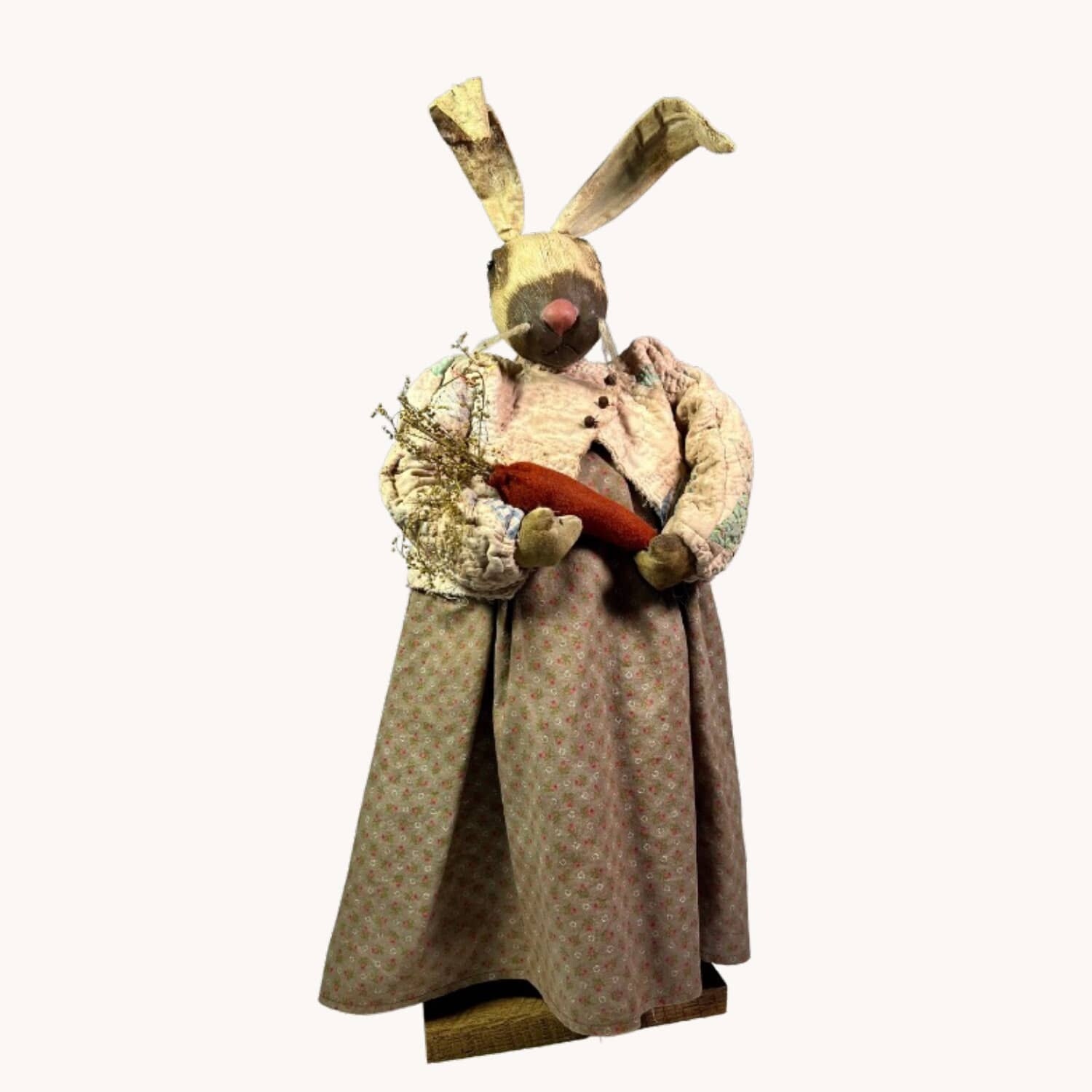 Easter and Spring decor just got better wit this Clay Faced Girl Rabbit Doll ! Handmade in the USA. This artist is dedicated to creating heirlooms. Details include old Tattered Quilt Jacket, carrot and wood base. In-stock and ready to ship.