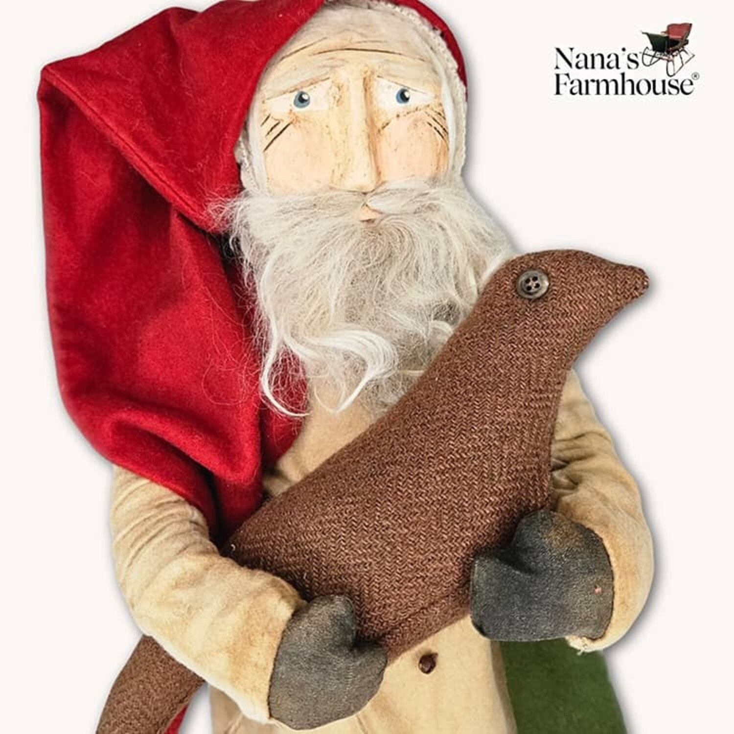 This primitive handcrafted Santa holding a small bird adds a cozy charm to any country or farmhouse display. Perfect as a wonderful accent for mantels and shelves. Timeless charm and exceptional detail.