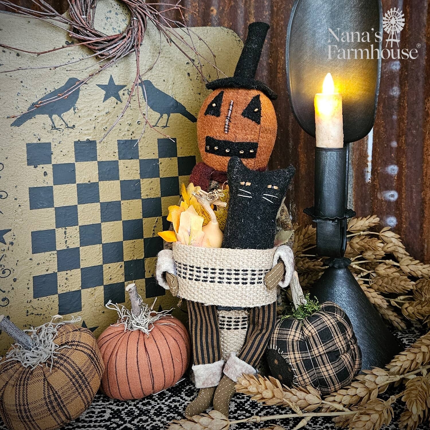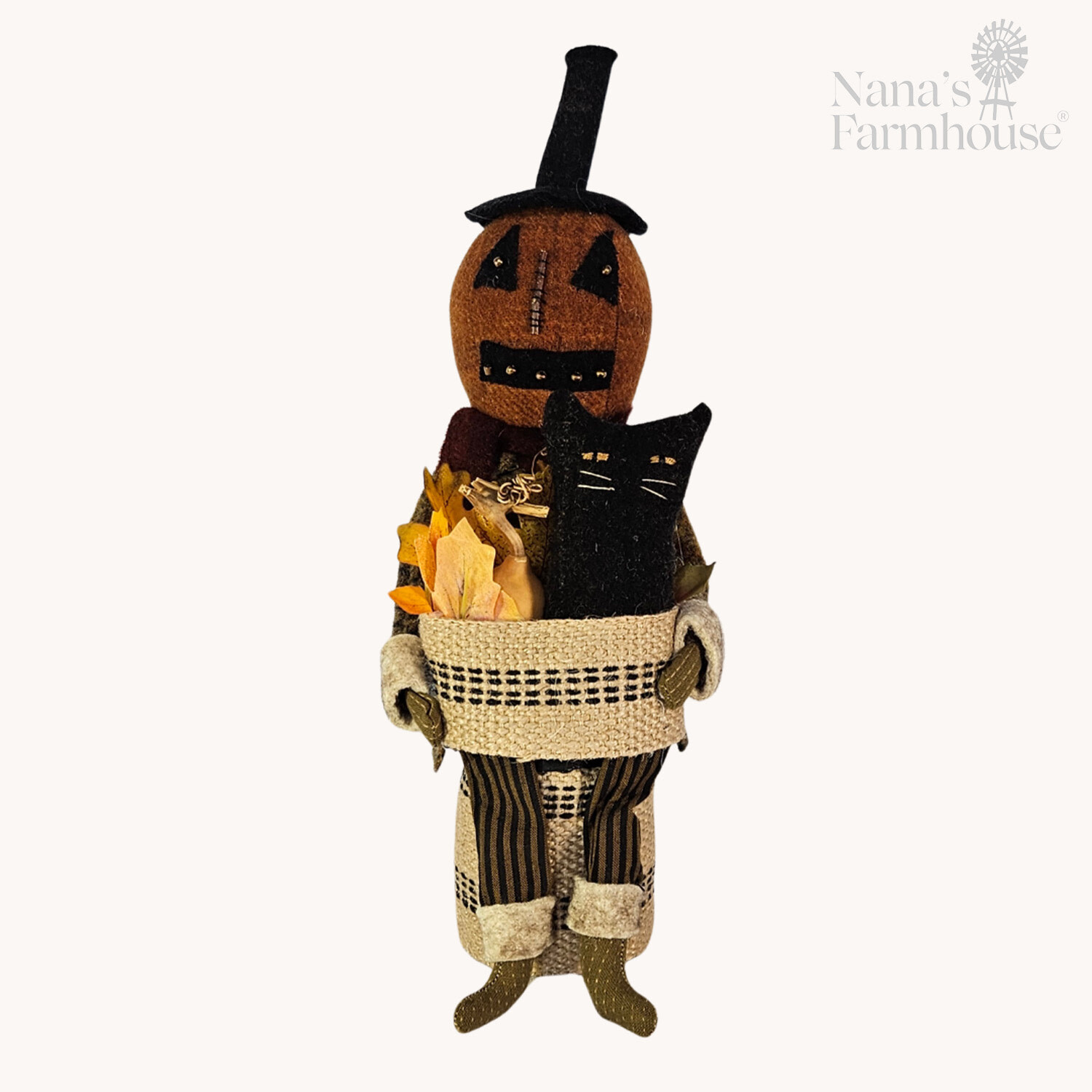 This little Pumpkin Man sitting has so many details for your Fall and Halloween decor! He's holding a basket of leaves with a gourd and a black cat popping out. Handmade in the USA.