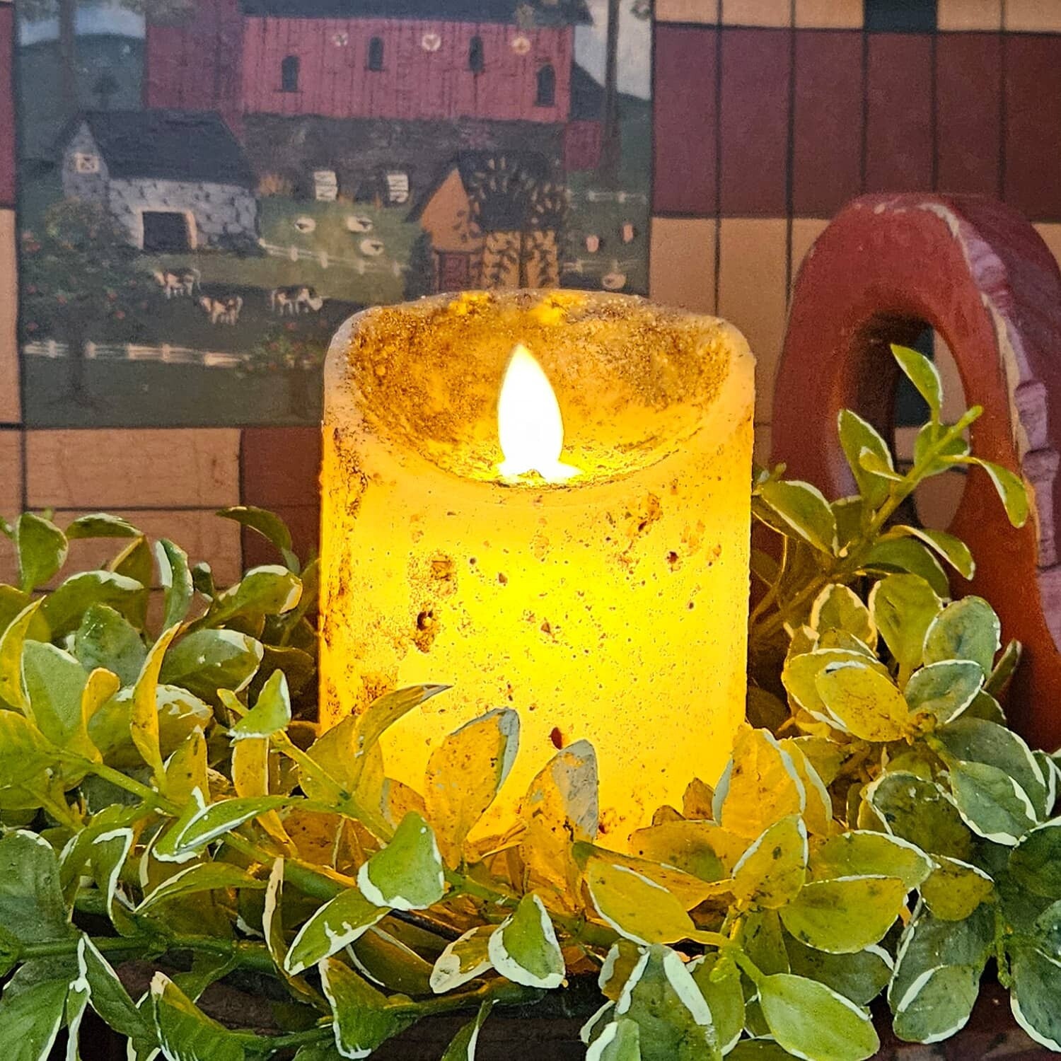 A touch of seeds and spice make this real look pillar "Oh so nice!" Moving flame technology which operates by 3 "AAA" batteries. Set your shelf or table aglow without the worry of flame. In stock and ready to ship.