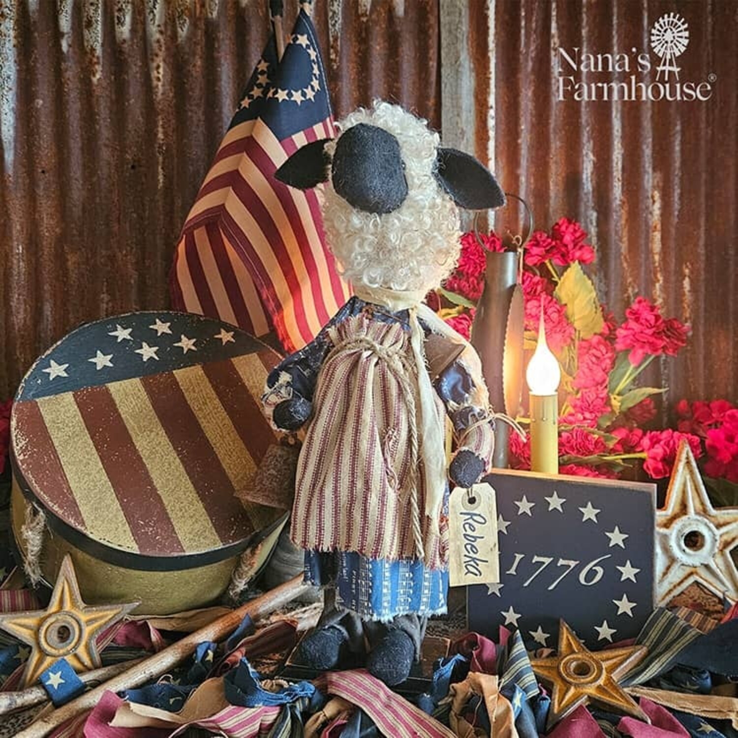 This is a charming girl sheep full of American charm. She's wearing a blue dress with a red ticking apron and rustic bell. Perfect for summer decorating, Fourth of July or everyday country decor.