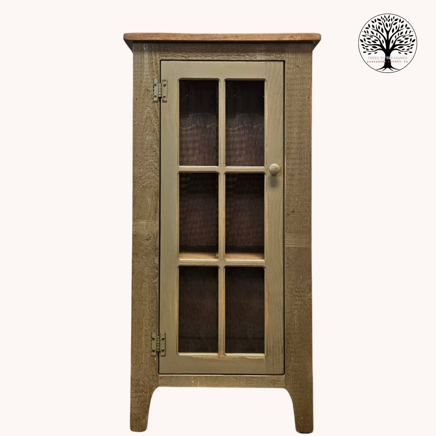 The unique look and texture of rough sawn wood gives your home a warm & cozy feel. This 6 Pane, one door, Curio Cabinet, is made in the USA. Made of solid wood. Features a barnwood top and one glass door.