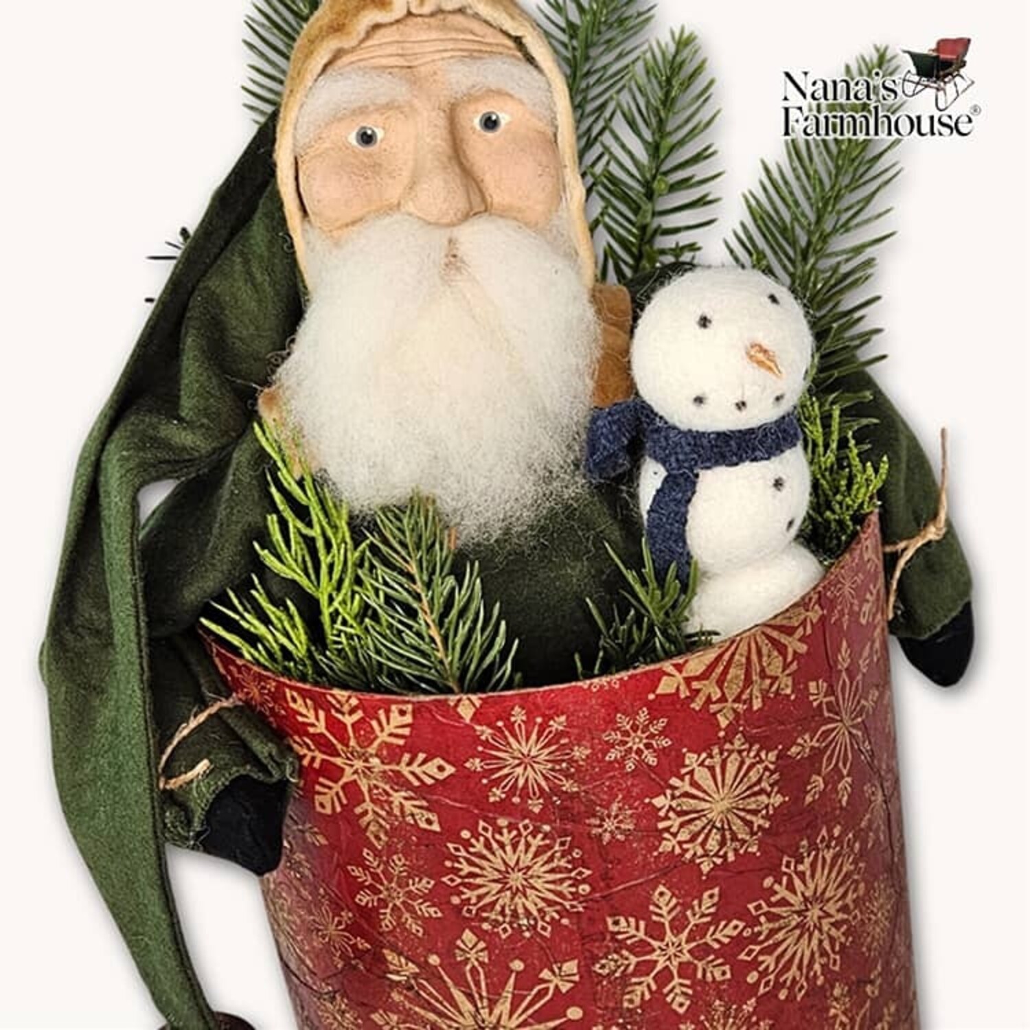 Santa Green Jacket In Red Snowflake Christmas Box Holding Snowman & Greenery - 13"