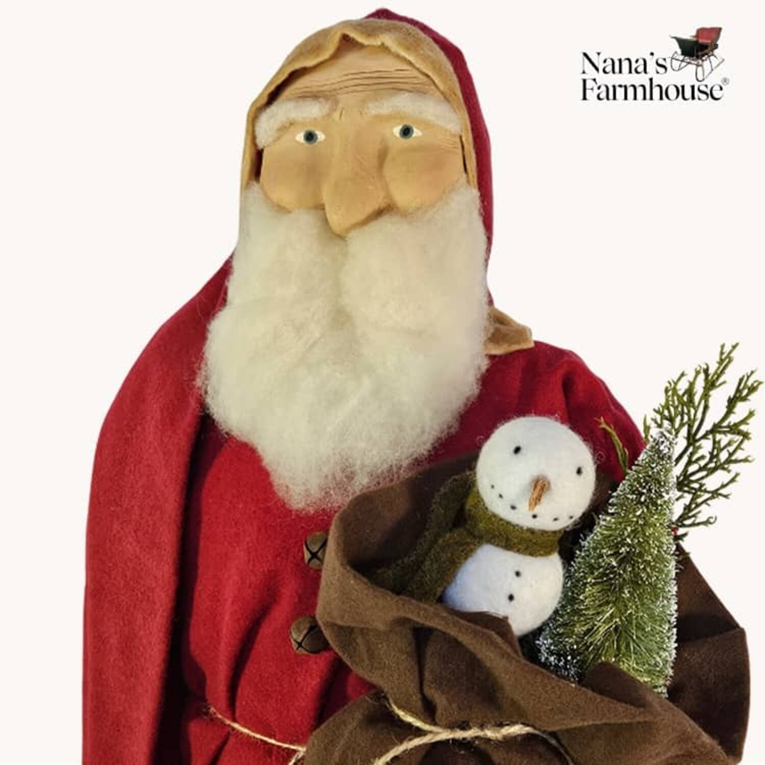 In his big brown bag, Santa holds a miniature snowman and bottle brush tree. Dressed in traditional red robe and pants, he is sure to become a holiday favorite. In stock and ready to ship.