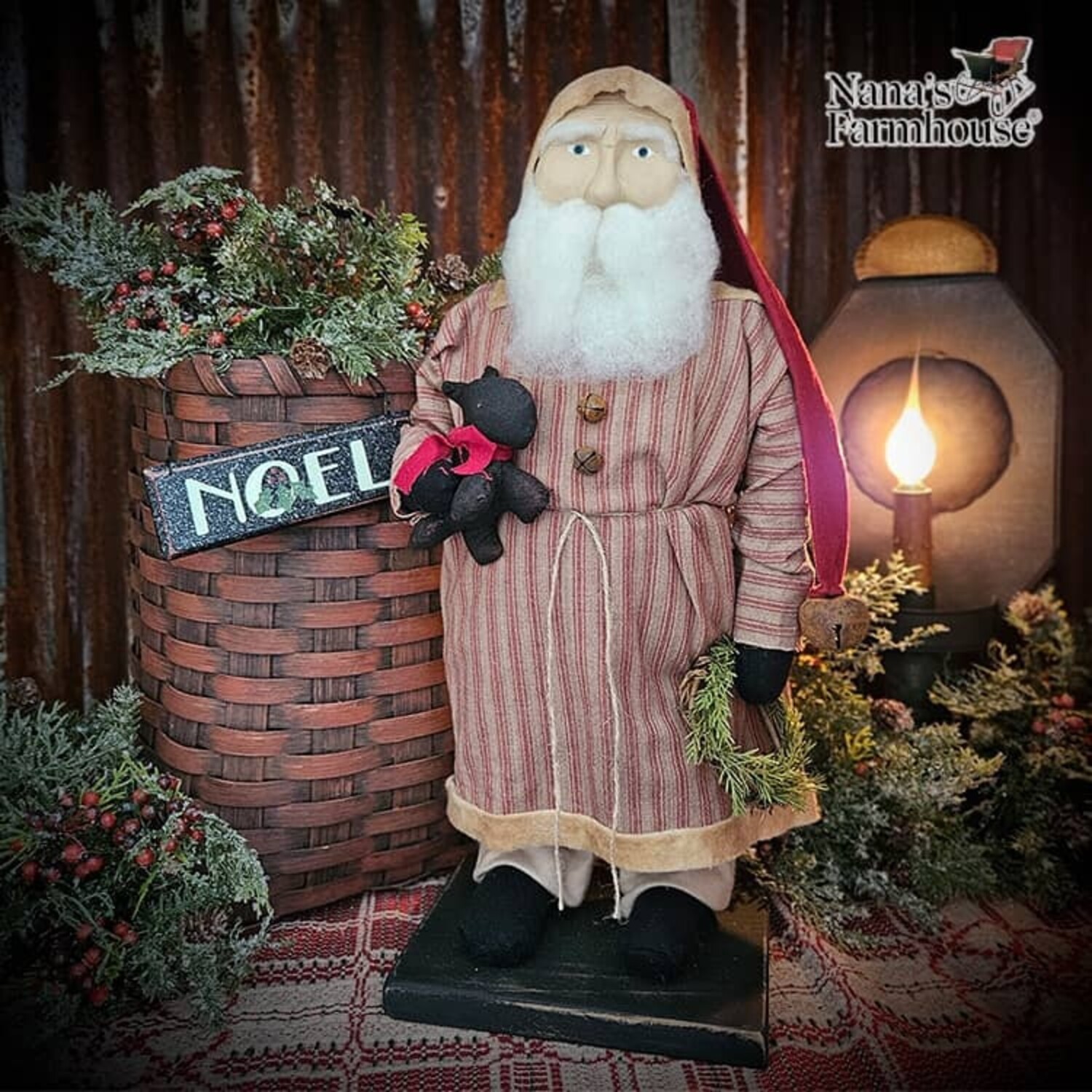 Santa is dressed in a primitive red ticking cloth coat and wearing a red stocking cap. Rusted bell hangs from end of long-tailed cap. But best of all, is a Scottie dog held in one arm. Endearing primitive folk charm. In stock and ready to ship.