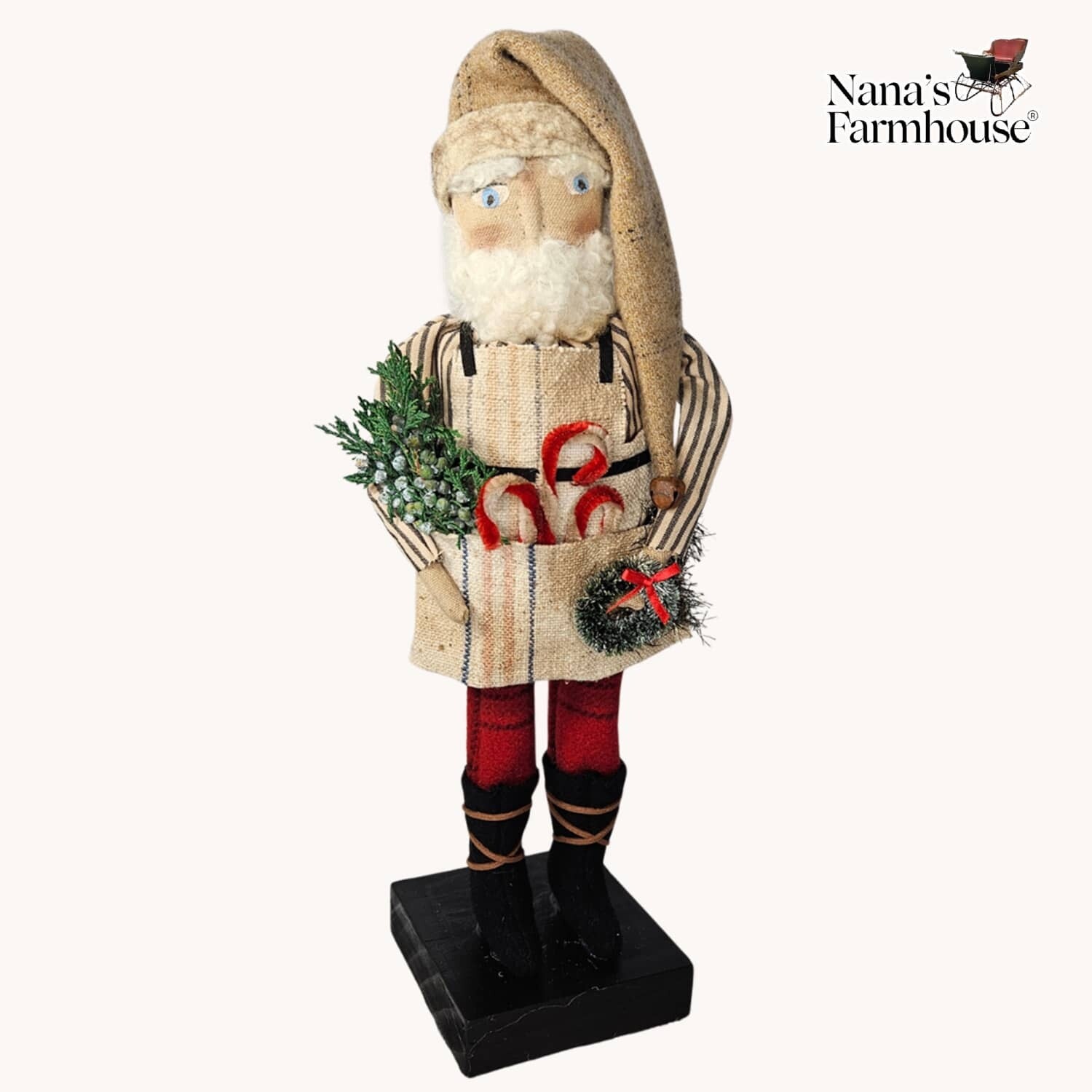 You can tell Santa has been hard at work to prepare for the holiday as he is wearing his work apron! His pockets are filled with candy canes & greenery. Hand stitched & hand painted facial features. He would make a delightful addition to your home!