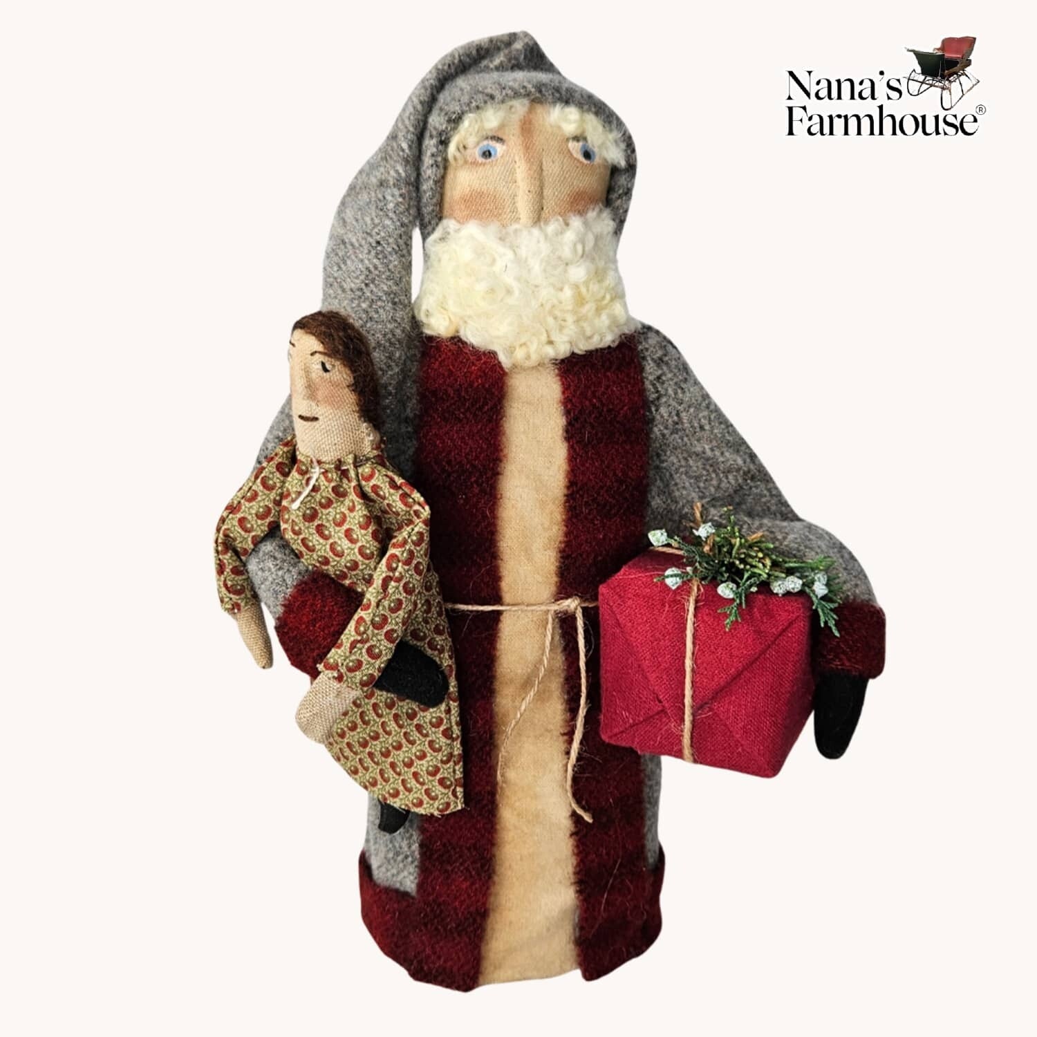 This adorable Santa is lovingly handmade in the USA. Features a baby doll under one arm and a wrapped present under the other.