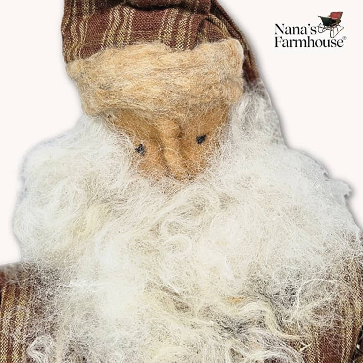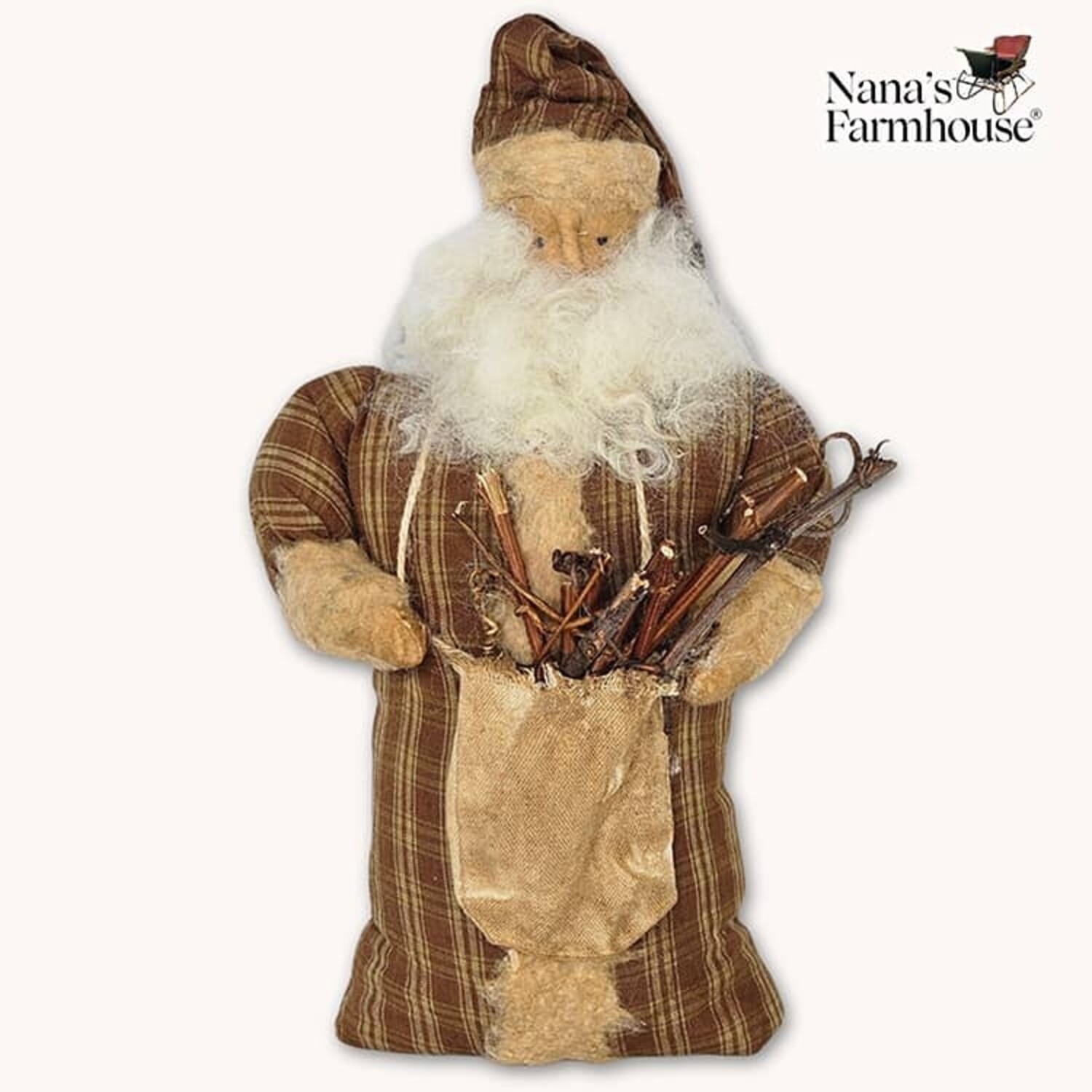 This rustic Santa is dressed in a cozy brown plaid robe carrying a weathered sack of gathered sticks. He adds a warm, primitive touch to any Christmas display.