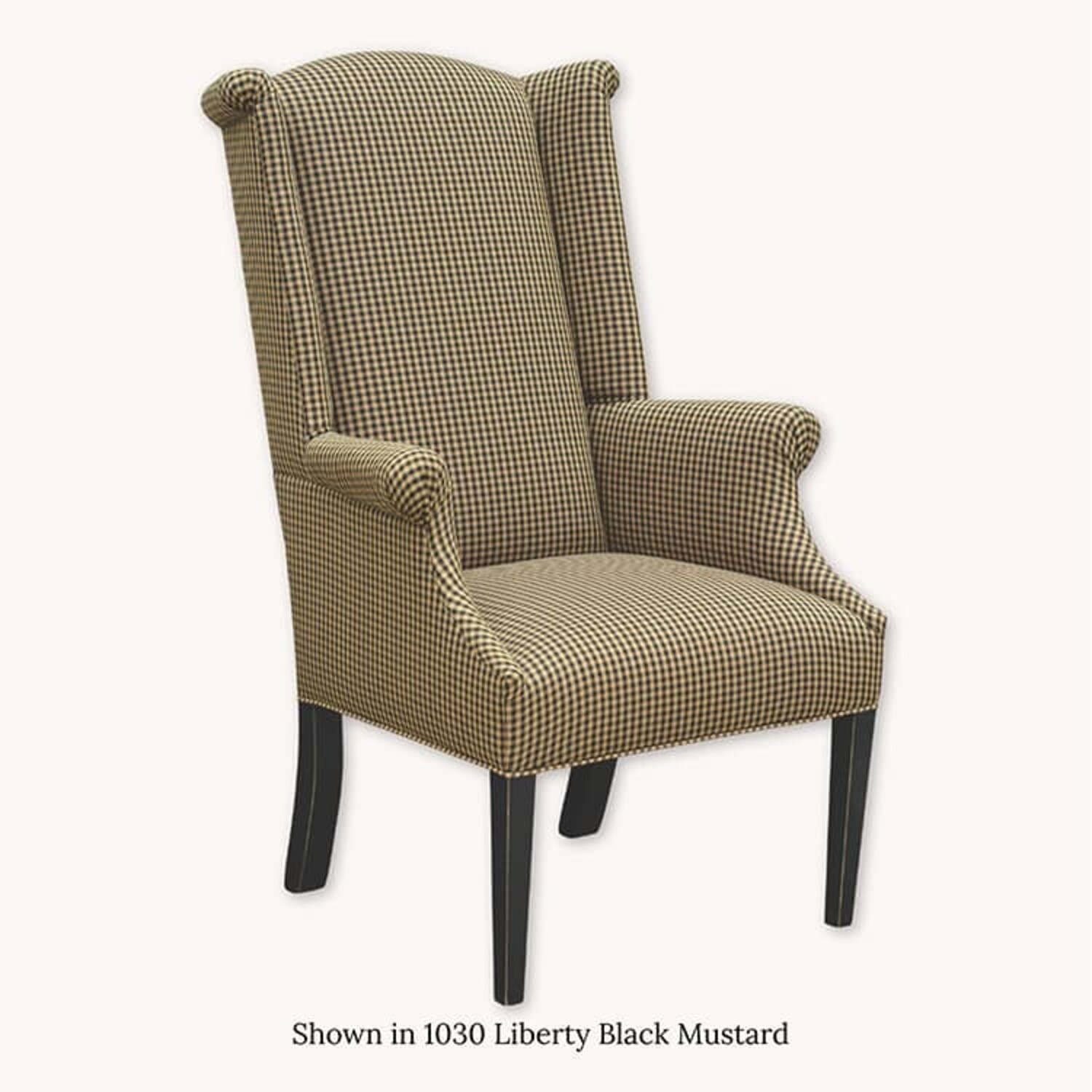 You'll love the charm of the Sarah Reaver Chair from the American Country Collection. Pick your favorite fabric. Designed for those who love country furniture with comforts of today. Displayed here in the Liberty Black Mustard fabric (1030).
