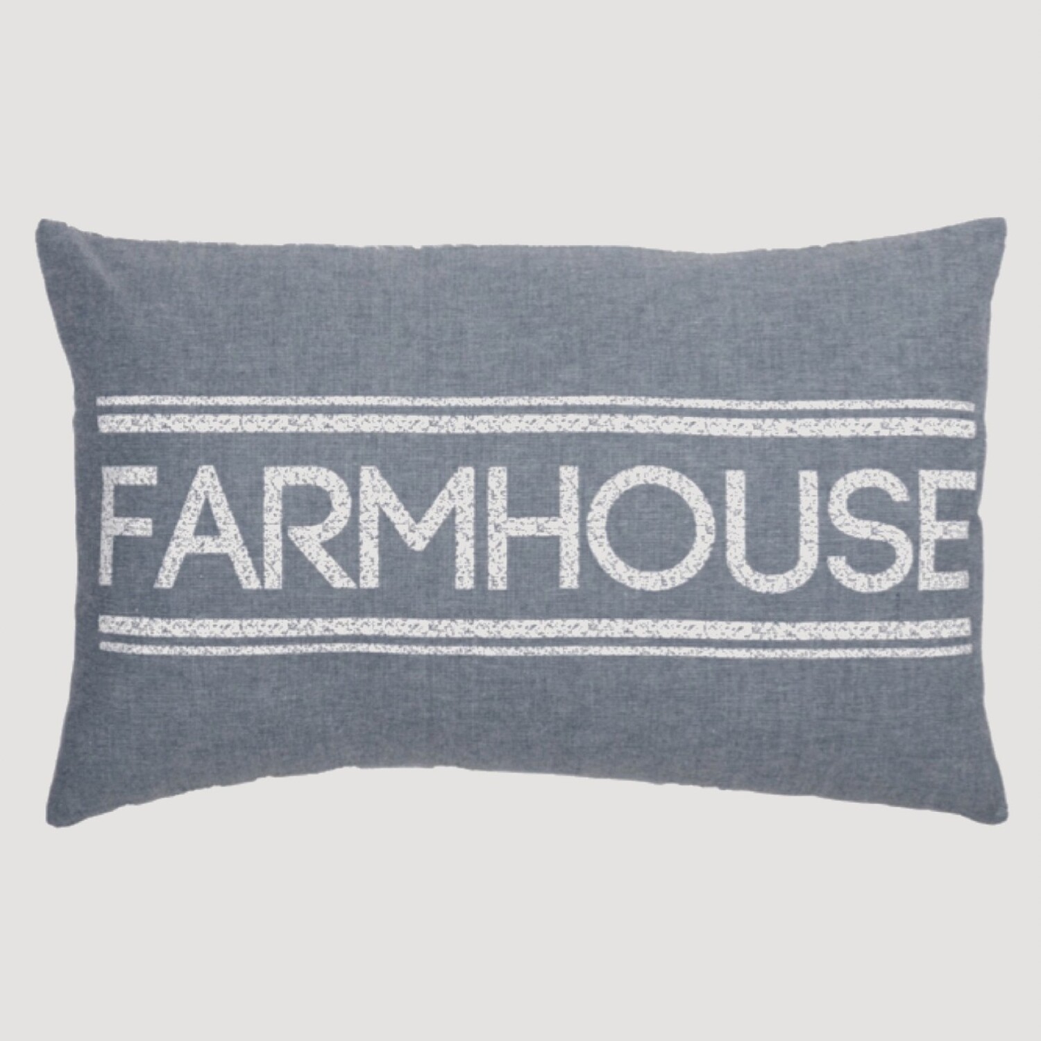 - FARMHOUSE ACCENT: This throw pillow contains the word "Farmhouse" stenciled in distressed black on khaki chambray base