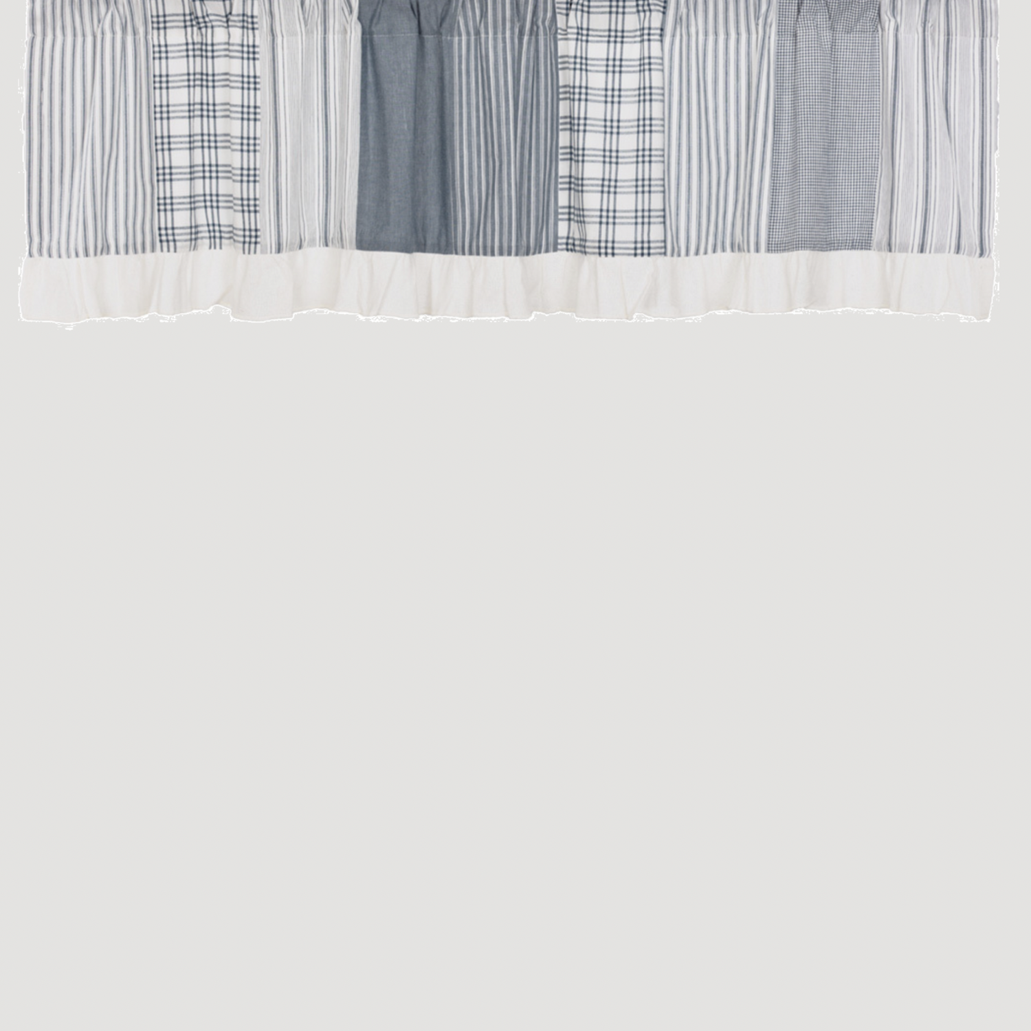 Availability: In Stock$25.95The Sawyer Mill Blue layered valance combines denim blue & soft white ticking stripes separated by a check pattern pointed edge with buttons to create the perfect blend of farmhouse elegance & country charm. This vintage curtain is lined. 100% cotton.- $22.95