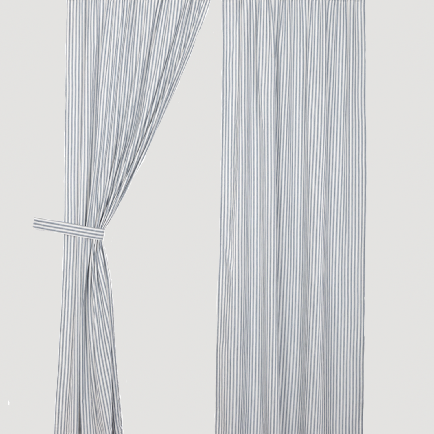 Bring a fresh look with the ticking stripe fabric of the Sawyer Mill Blue Ticking Stripe Panel Set, This window treatment features textured cotton fabric in denim blue & soft white ticking stripes for your farmhouse style home.