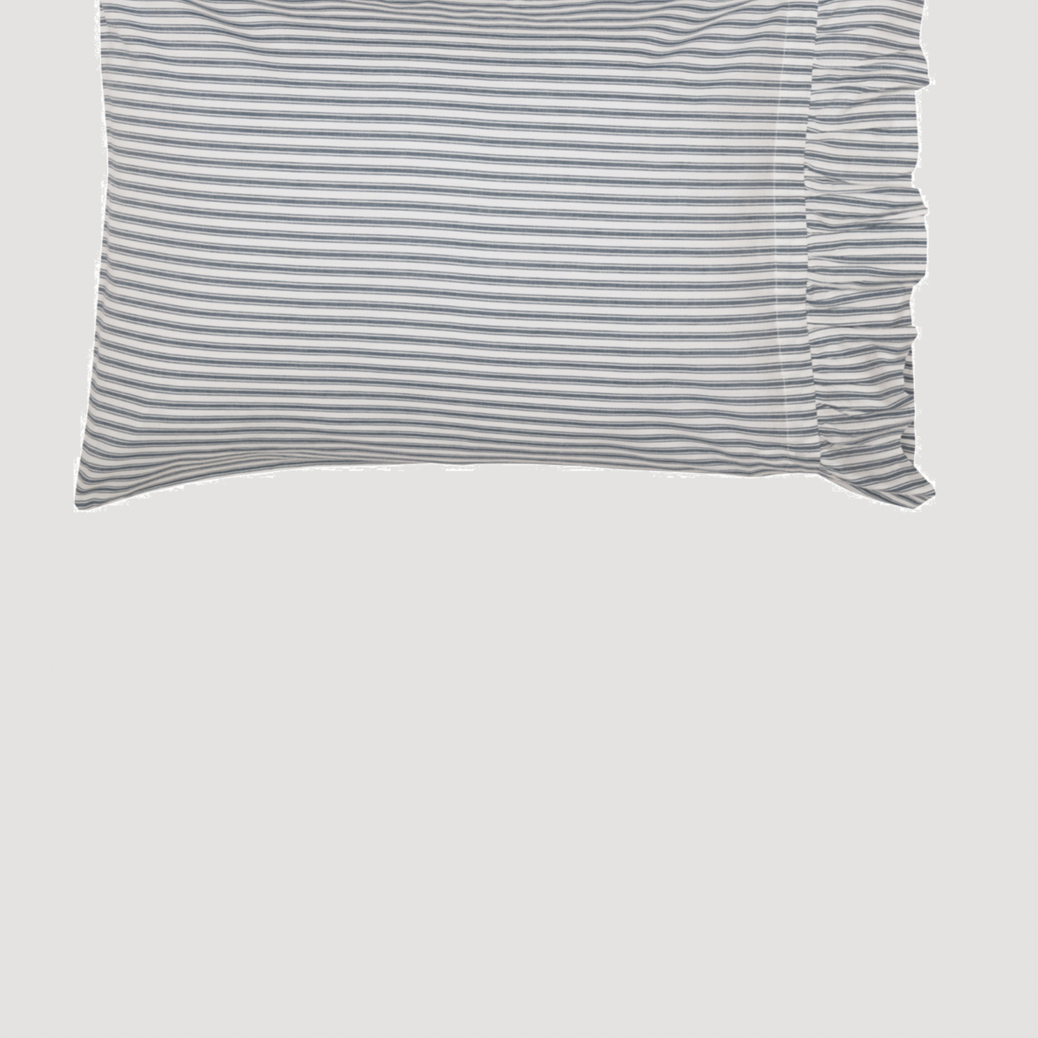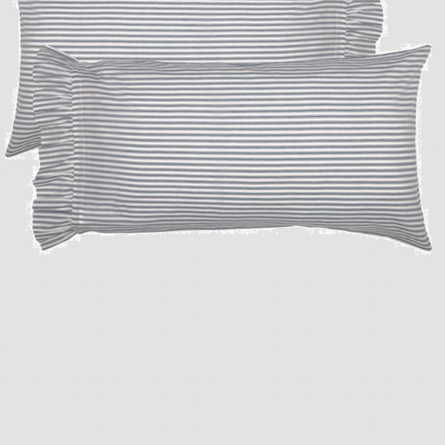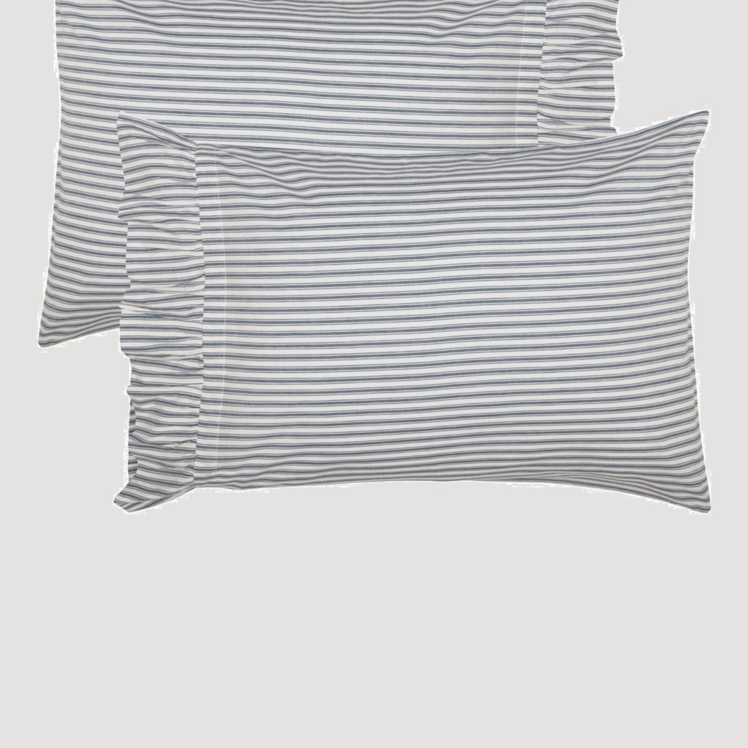 The Sawyer Mill Blue Ticking Stripe Pillow Case Set completes the look of your bed with a classic, vintage feel. Featuring denim blue & soft white ticking stripes on beautifully textured cotton fabric, finished with a ruffle at the opening.