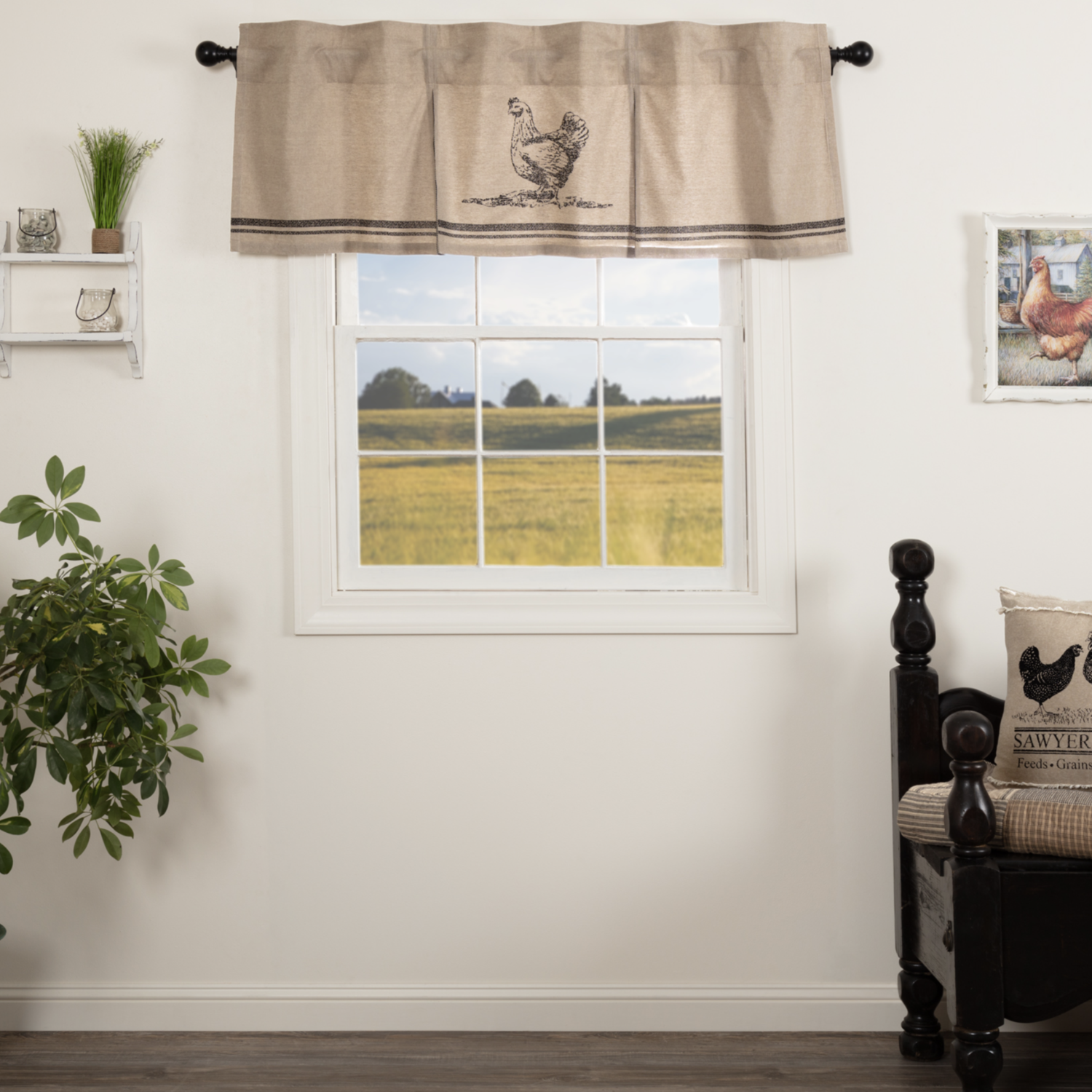 The Sawyer Mill Charcoal Valance Curtain Pleated features textured, solid cotton chambray base with a chicken in center stenciled with distressed color, accented with pleats on either side, underside of pleat lined with contrasting colored microcheck fabr