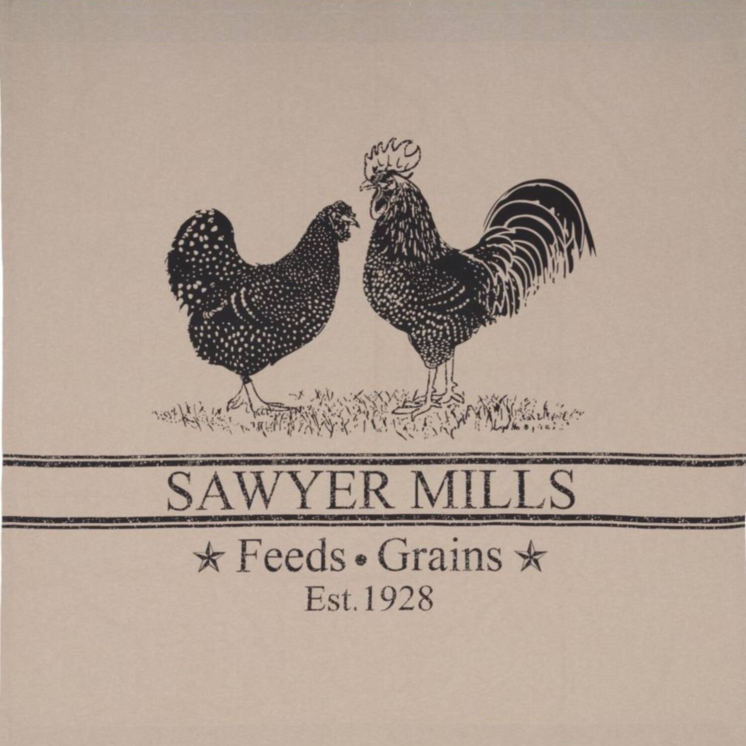 - FARMHOUSE ACCENT: This shower curtain contains a large stenciled hen and rooster in distressed black, accented with Sawyer Mills Farm details and grain sack stripes