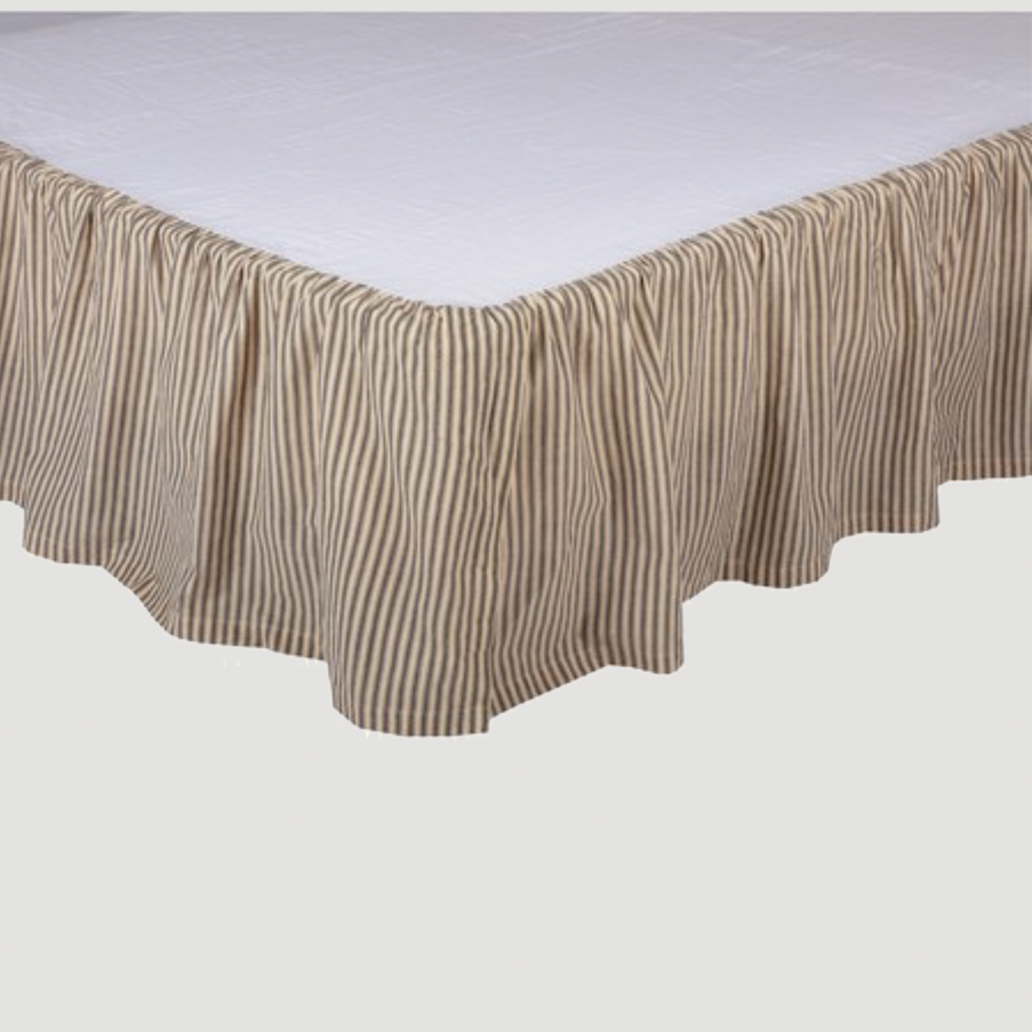 Add a true farmhouse touch with the Sawyer Mill Charcoal Ticking Stripe Bed Skirt. Featuring black & dark creme ticking stripe gathered ruffle with 16 inch drop. Finished with a standard 1 inch hem fold to complete the farmhouse look.