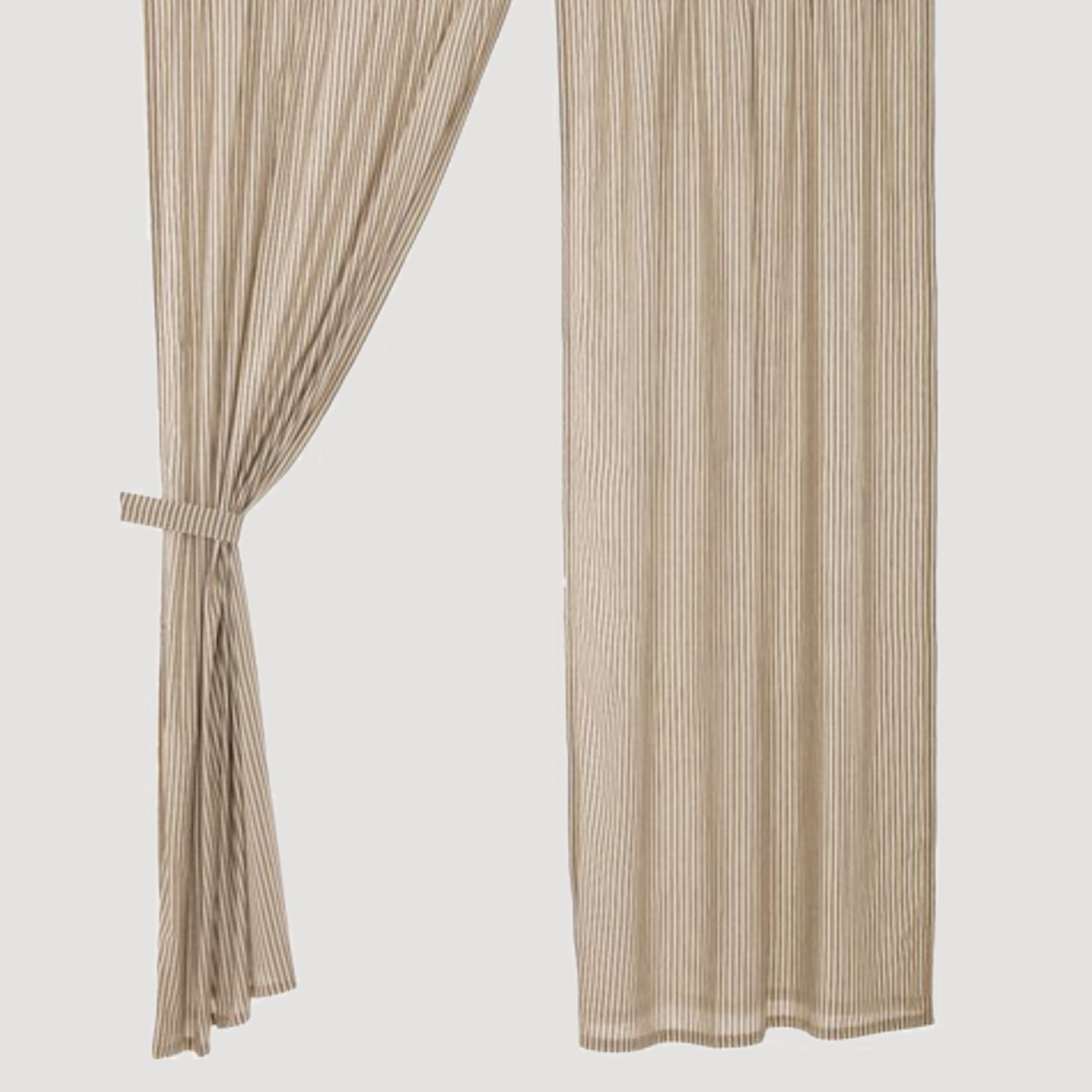 The Sawyer Mill Charcoal Ticking Stripe Short Panel Curtains features repeating, black ticking stripes woven into dark creme cotton base. Lined with white cotton to reduce fading & light penetration, finished with a standard 3 inch hem fold.